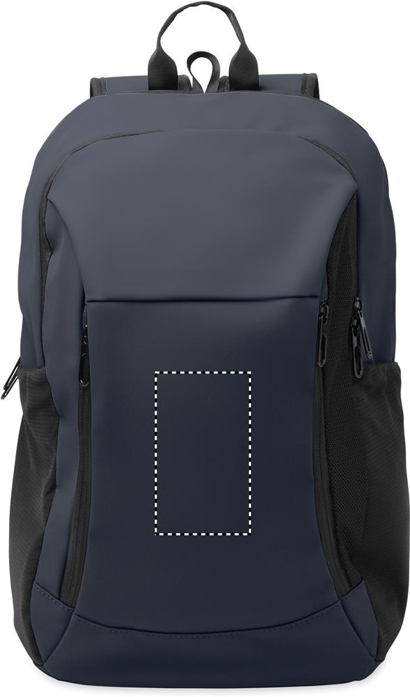 15 collu klēpjdatora mugursoma no mīksta PU materiāla ar polsterētu aizmuguri un slēptu galveno nodalījumu ar rāvējslēdzēju. 1 priekšējā kabata ar rāvējslēdzēju, 2 priekšējās sānu kabatas ar rāvējslēdzējiem un 2 elastīgas sānu kabatas ar sietu. Ar 210D RPET oderi.