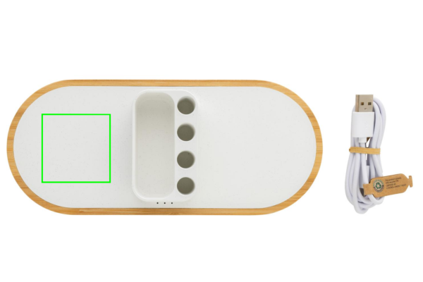 Divkāršs 10 W ātrais bezvadu lādētājs ar pildspalvas turētāju, kas izgatavots no RCS (Recycled Claim Standard) sertificēta pārstrādāta ABS. Kopējais pārstrādātais saturs: 31% no kopējās preces svara. RCS sertifikācija nodrošina pilnībā sertificētu pārstrādāto materiālu piegādes ķēdi. Pamatne ir izgatavota no FSC®100% bambusa. Bezvadu uzlāde ir saderīga ar jaunākās paaudzes Android, iPhone 8 un jaunākām ierīcēm. Var uzlādēt divus tālruņus vienlaikus vai jebkuru citu bezvadu ierīci. Ar 4 pildspalvu caurumiem pildspalvu/zīmuļu uzglabāšanai un nelielu glabātuvi vizītkartēm vai citiem maziem priekšmetiem. Preces un piederumi bez PVC. Ietver 120 cm C tipa uzlādes kabeli, kas izgatavots no RCS sertificēta otrreizēji pārstrādāta TPE. Iepakots FSC®mix kraft kastē. Type-C in; Ieeja 5V/2A; 9V/2A; Bezvadu izeja 5V/1A;9V/1.1A; (10W) Reģistrēts dizains®