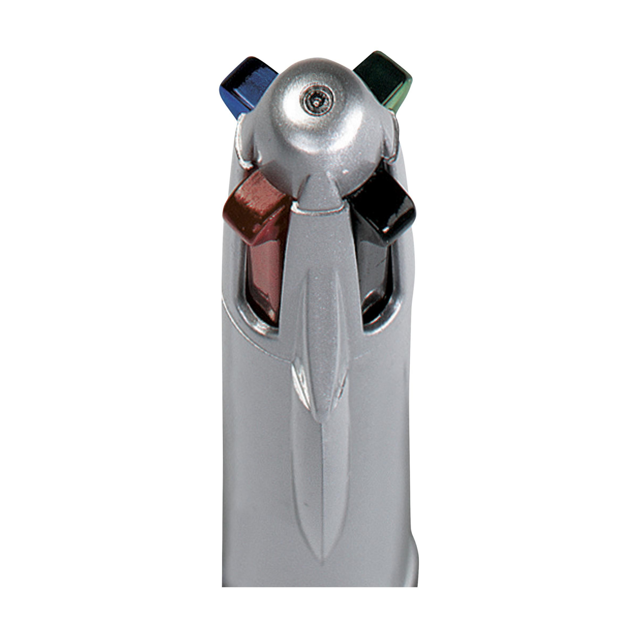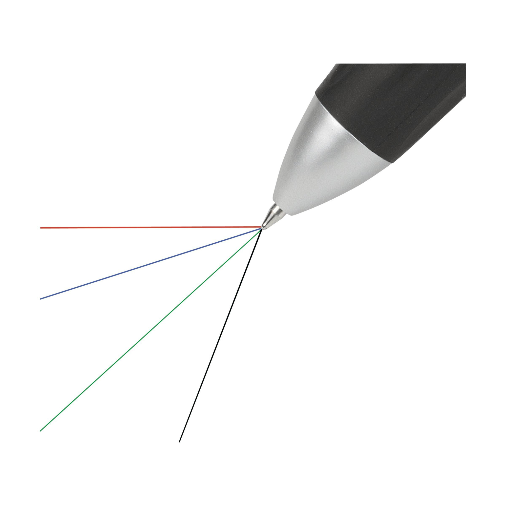 4 krāsu lodīšu pildspalva ar neslīdošu gumijas rokturi. Aprīkots ar zilu, zaļu, sarkanu un melnu tinti.