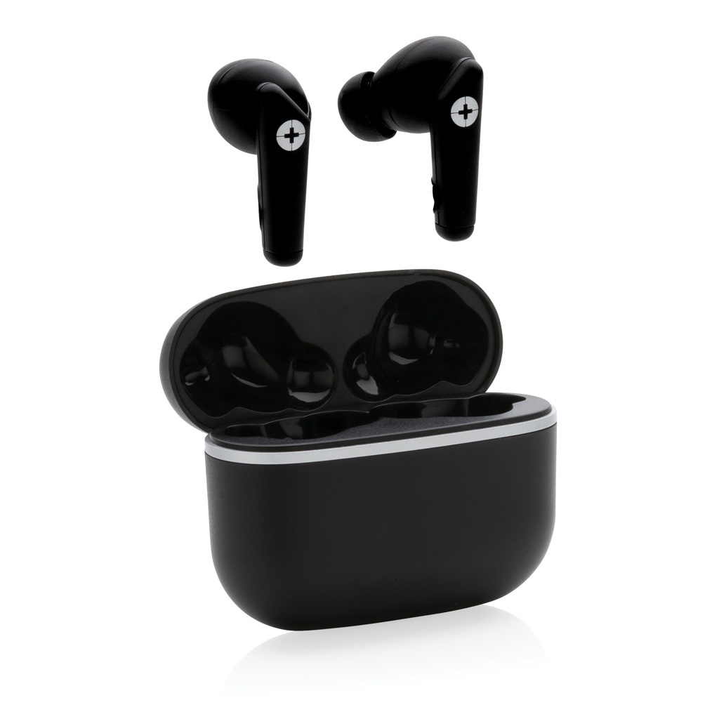 Jaunās paaudzes īstas bezvadu austiņas. Austiņas un uzlādes futrālis ir izgatavoti no RCS (Recycled Claim Standard) sertificēta pārstrādāta ABS. Kopējais pārstrādātais saturs: 59% no kopējā preces svara. RCS sertifikācija nodrošina pilnībā sertificētu pārstrādāto materiālu piegādes ķēdi. Austiņas ir iekļautas kompaktā 400 mAh uzlādes maciņā, kas ļauj uzlādēt un ņemt līdzi austiņas, lai kur jūs dotos. Austiņas izmanto BT 5.3 automātiskai savienošanai pārī bez problēmām un ar stabilu savienojumu. Austiņām ir 40 mAh akumulators, kas nodrošina atskaņošanas laiku līdz 4 stundām, un to var atkārtoti uzlādēt 1,5 stundās uzlādes futrālī. Bezvadu sakaru attāluma diapazons ir līdz 10 metriem. Ietver C tipa uzlādes kabeli, kas izgatavots no GRS sertificēta pārstrādāta TPE. Iepakots FSC® mix dāvanu kastītē. Prece un aksesuāri 100% bez PVC