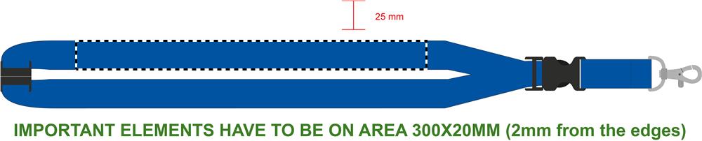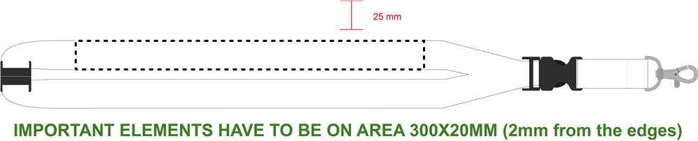 Siksna ar metāla āķi, noņemamu sprādzi un drošības atdalāmu. 25 mm plats. Sublimācijas druka pieejama tikai uz balta izstrādājuma.