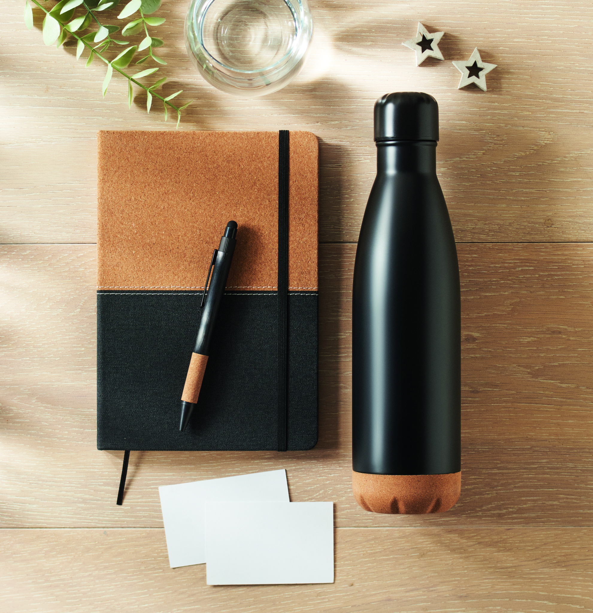 3 piece gift set including a double wall stainless steel insulated bottle 500ml, A5 notebook with hard RPET and cork casebound cover with 160 lined recycled paper pages (80 sheets) and an aluminium push ball pen. Blue ink. FSC®-certified | FSC MIX CREDIT, P7.1, N3.7, FSC-C213206