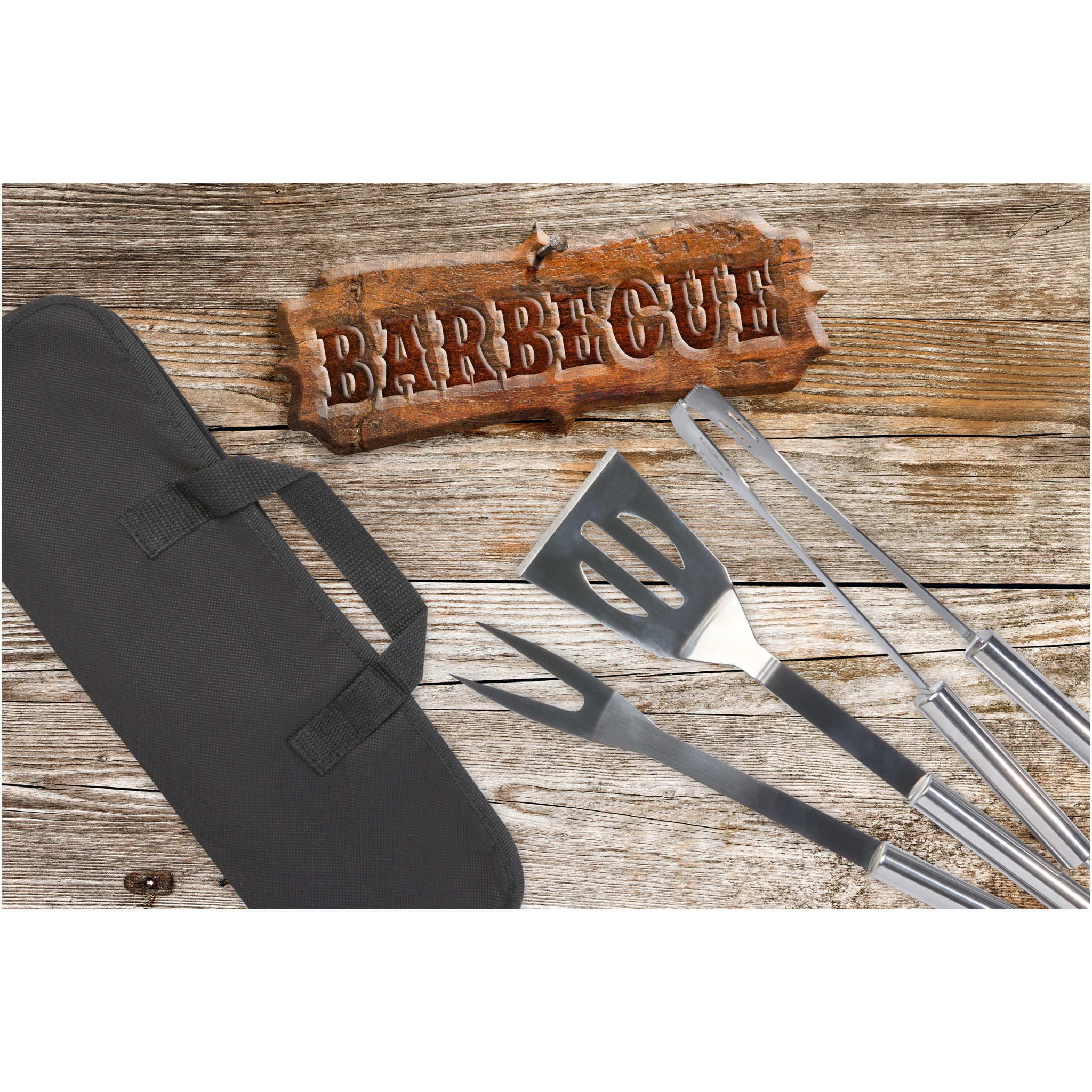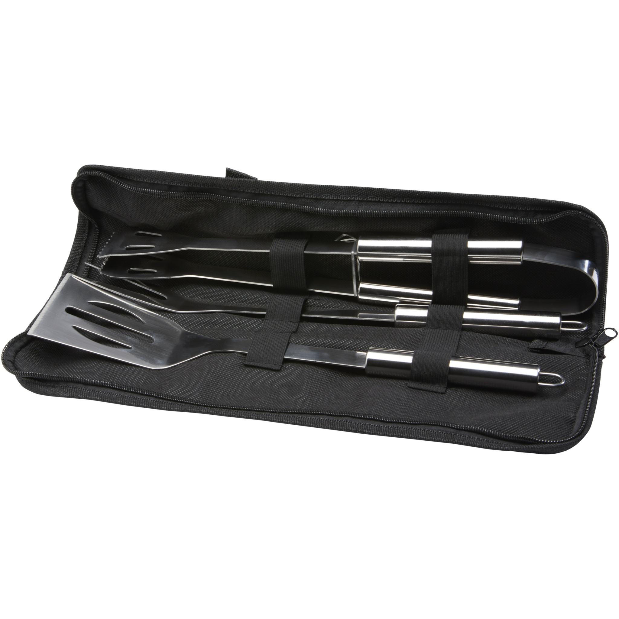 Набор для барбекю из 3 предметов: лопатка (34,8 x 7,5 см), вилка (35,4 x 3,35 см) и щипцы (35 x 6,8 x 4 см). Все аксессуары поставляются в легком футляре для удобства переноски и хранения. Идеальный аксессуар для барбекю в саду или для того, чтобы взять с собой для приготовления еды на гриле на открытом воздухе с друзьями и семьей.