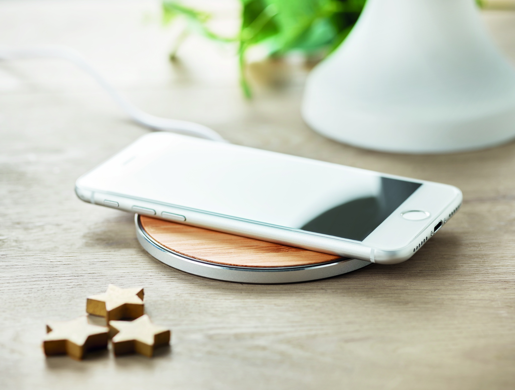 Беспроводное быстрое зарядное устройство из бамбука и алюминия. При зарядке горит синий индикатор. Выход: DC9V/1.1A (10W). Совместим со всеми устройствами с поддержкой QI, такими как последние версии Android, iPhone® 8, X и новее. Бамбук - это натуральный продукт, возможны небольшие различия в цвете