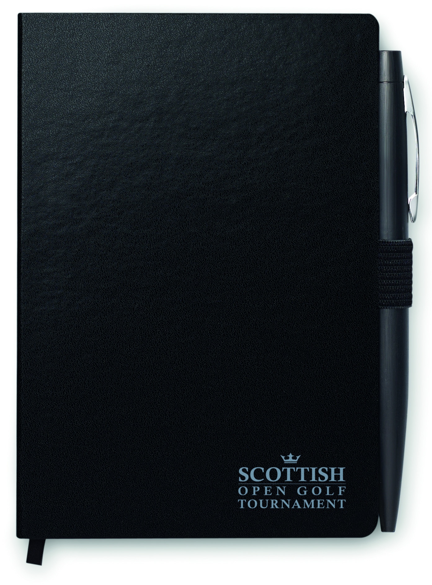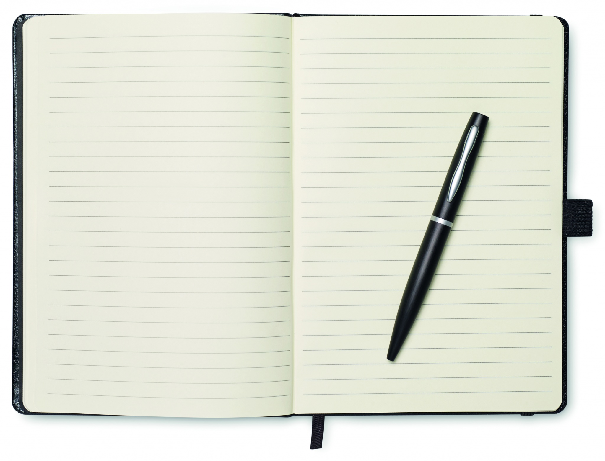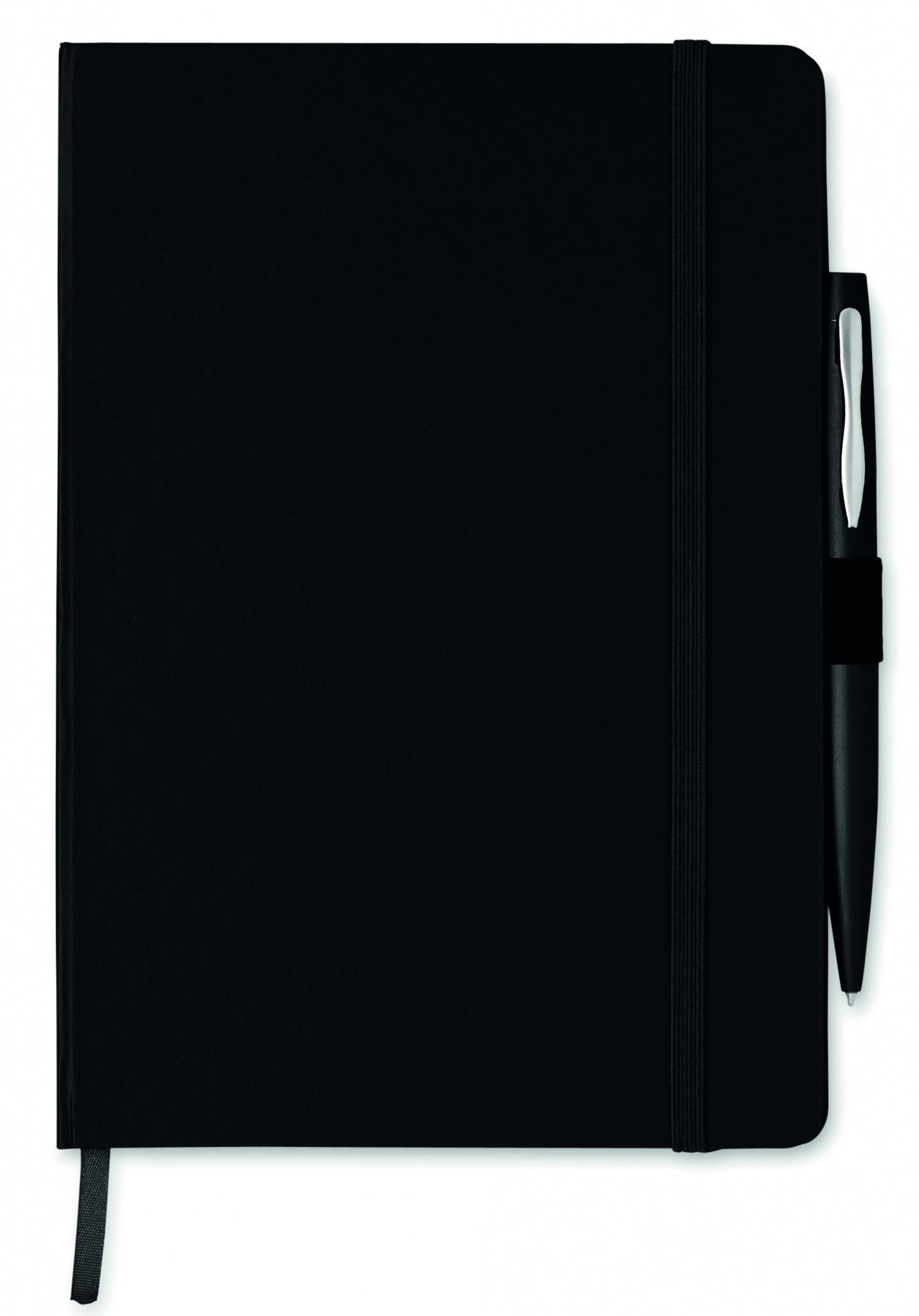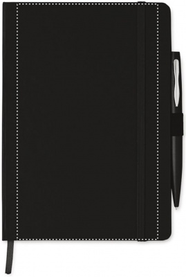 Блокнот A5 с обложкой из картона, 72 линованных листа, с лентой- закладкой, перетянут резинкой. Включает металлическую шариковую ручку с синими чернилами.