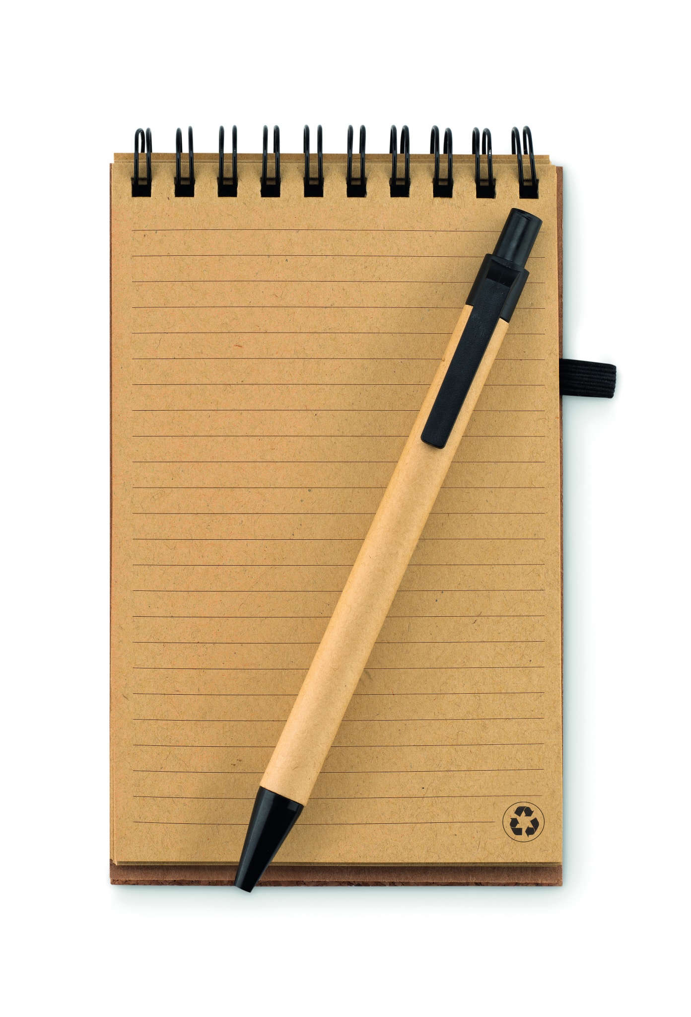 Блокнот с обложкой из пробки. Формат A6. Блок на 70 листов линованной переработанной бумаги и шариковая ручка, в корпусе из переработанной бумаги и фурнитурой из кукурузного пластика. Черные чернила.