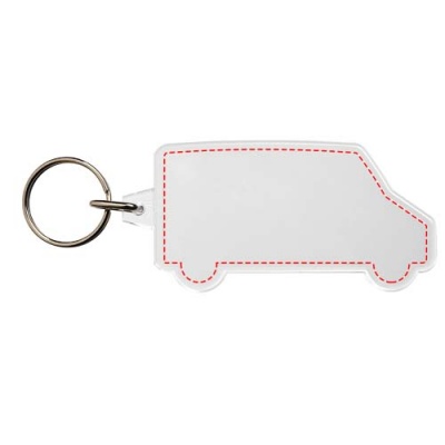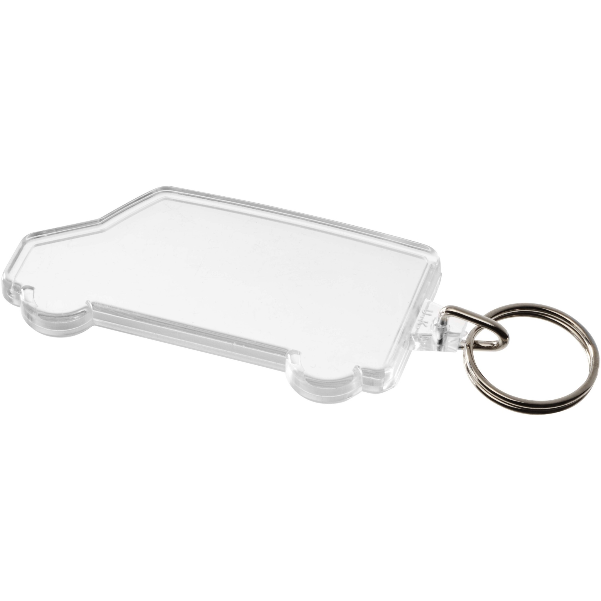 Прозрачный брелок в форме фургона с металлическим разъемным кольцом. Металлическая петля для крепления кольца представляет собой плоский профиль, что делает его идеальным для пересылки. Размеры печатной вставки: 6,9 см x 2,9 см.