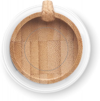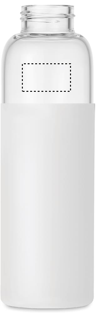 Стеклянная бутылка в силиконовом чехле с бамбуковой крышкой на хлопковом ремешке для запястья. Не подходит для газированных напитков. Герметична. Емкость: 500 мл.