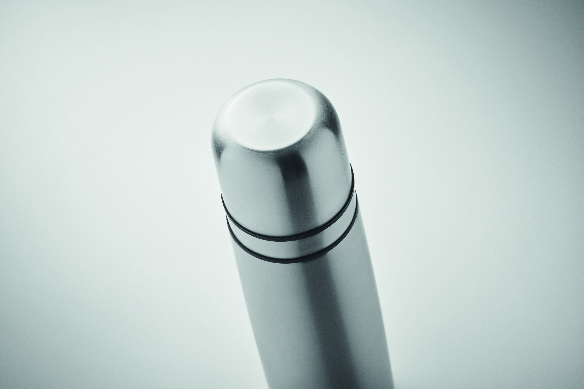 Double wall recycled stainless steel (90% recycled stainless and 10% stainless steel) insulated vacuum flask with 2 integrated cups (inner wall PP) in lid. Capacity bottle: 750 ml, outer cup: 150ml, inner cup: 125ml.