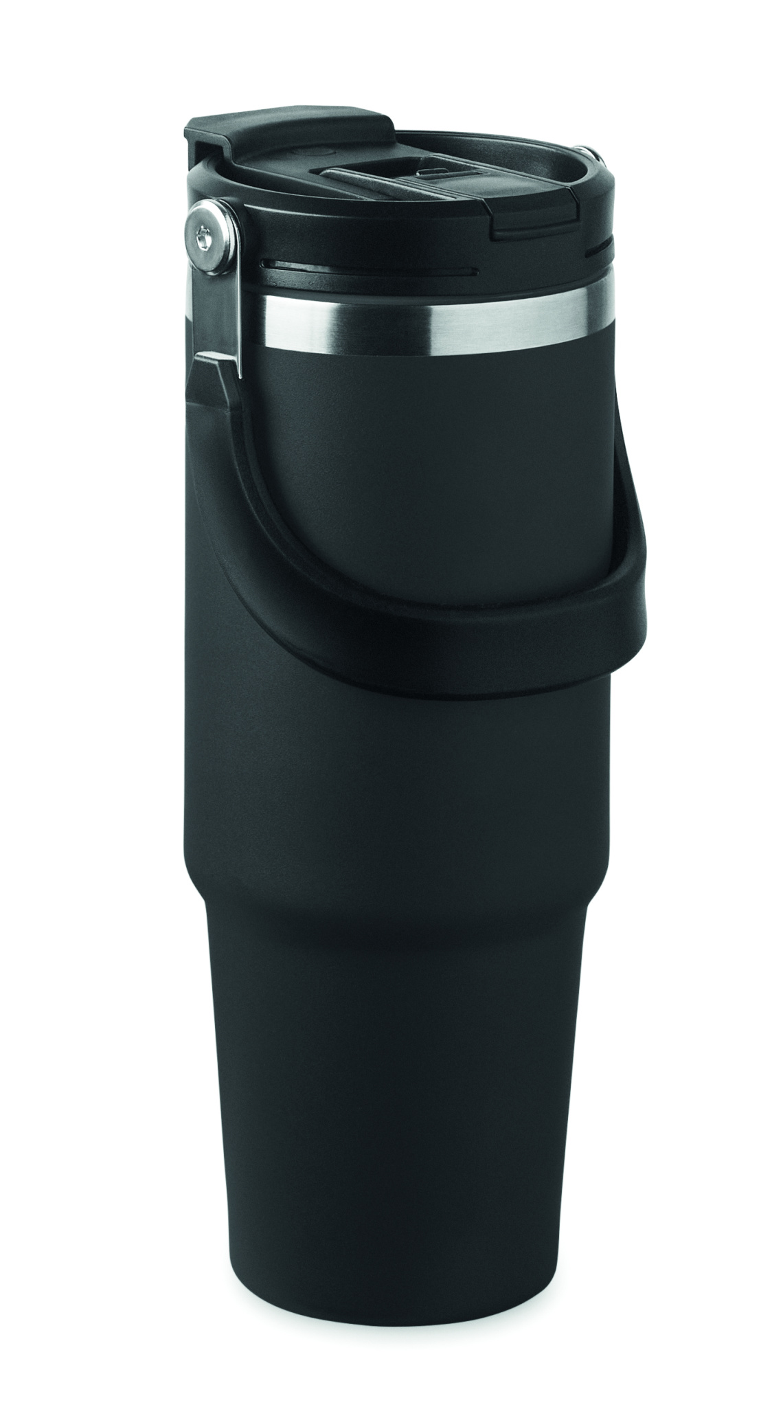 Double wall recycled stainless steel (90% recycled stainless steel and 10% stainless steel) tumbler with lid with inner straw, foldable mouth piece and direct drinking opening . Capacity 850 ml.