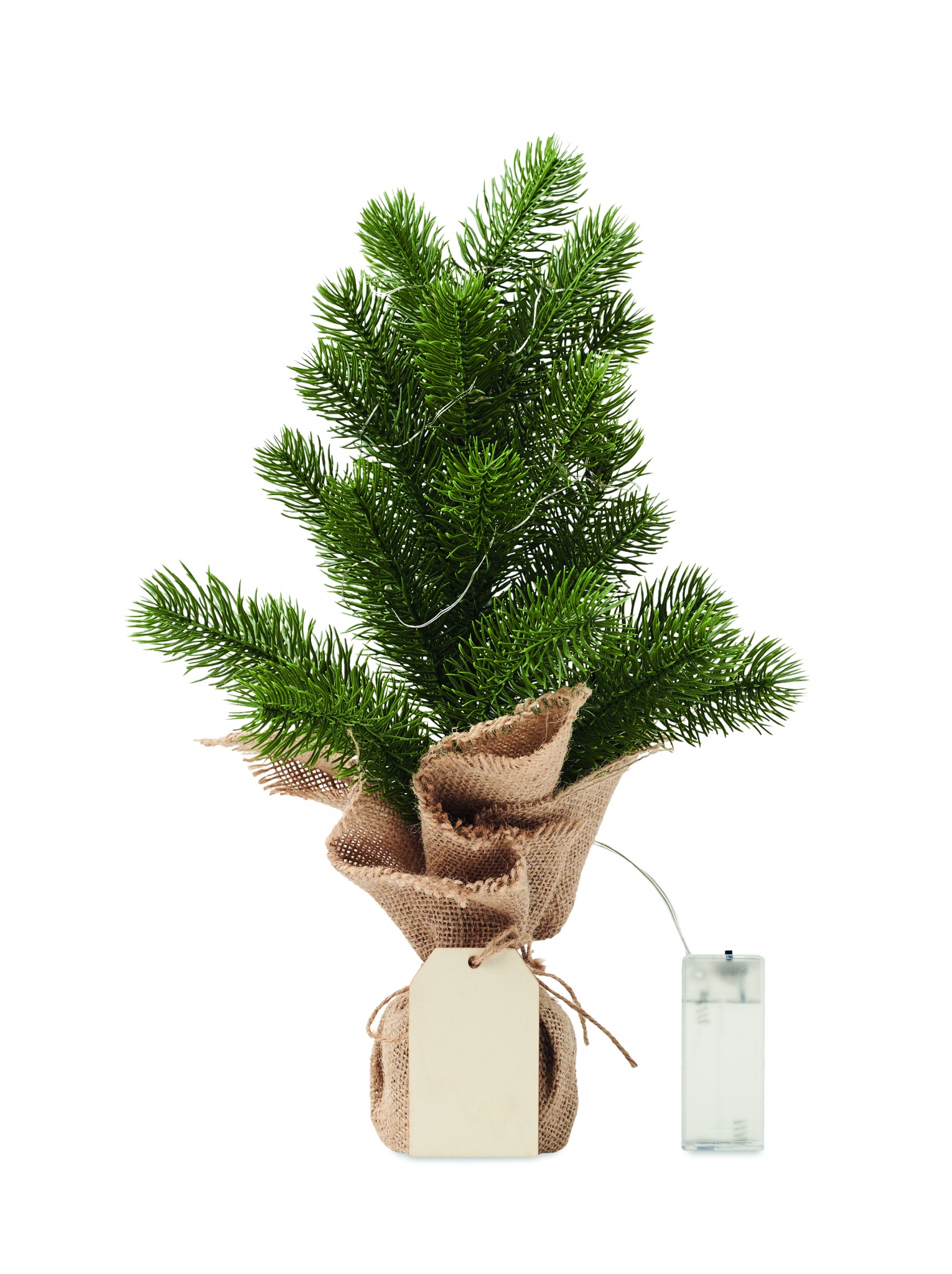 Мини-елочка из искусственного материала (полиэтилен) с 20 светодиодными лампочками теплого желтого оттенка на джутовой подставке. Поставляется с деревянной подарочной биркой. 2 батарейки типа АА в комплекте.