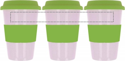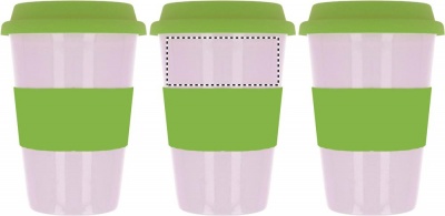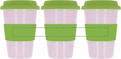 Одностенчатая керамическая кружка с силиконовой крышкой и ободком. Емкость 400мл . Керамотрансфер подойдет для мытья в посудомоечной машине. Поскольку это одностенчатая кружка , осторожно - может нагреваться!