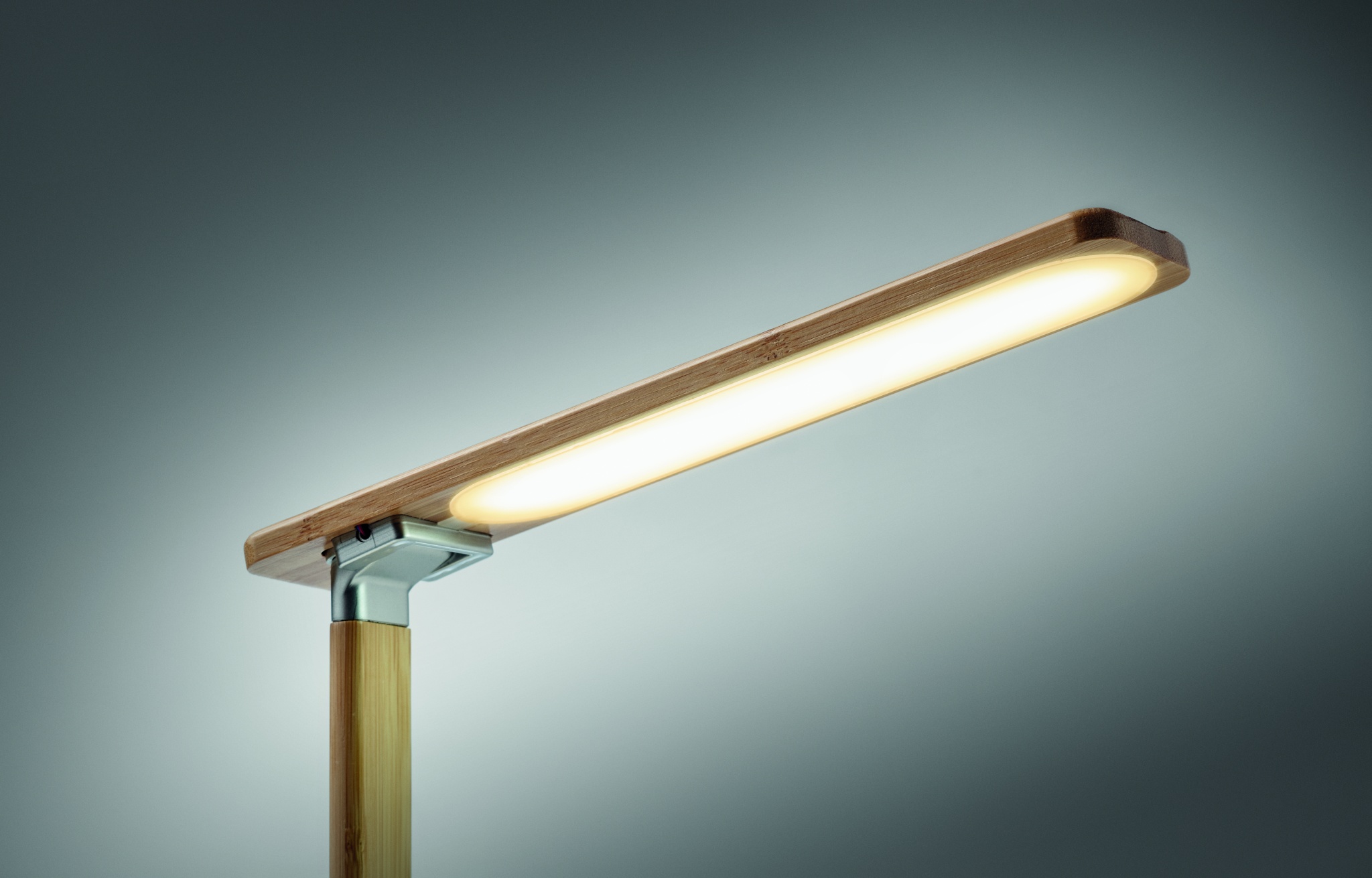 Настольная диодная лампа из бамбука с б/п зарядкой 10Вт и 2USB портами. Сенсорный экран. Выход: DC 9V/1.1A (10W) для быстрой зарядки. Совместима с последними моделями Androids, iPhone® 8 и новее.