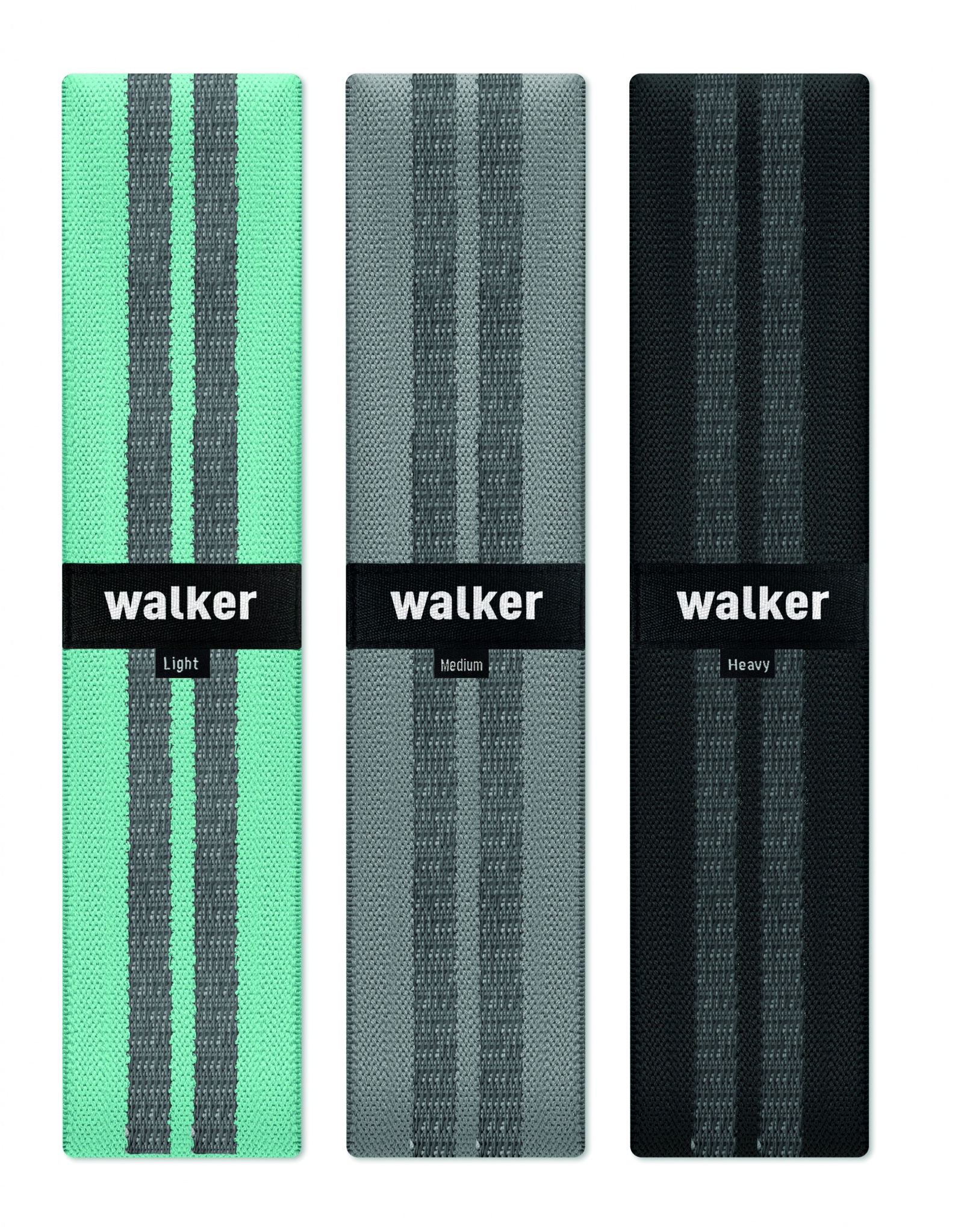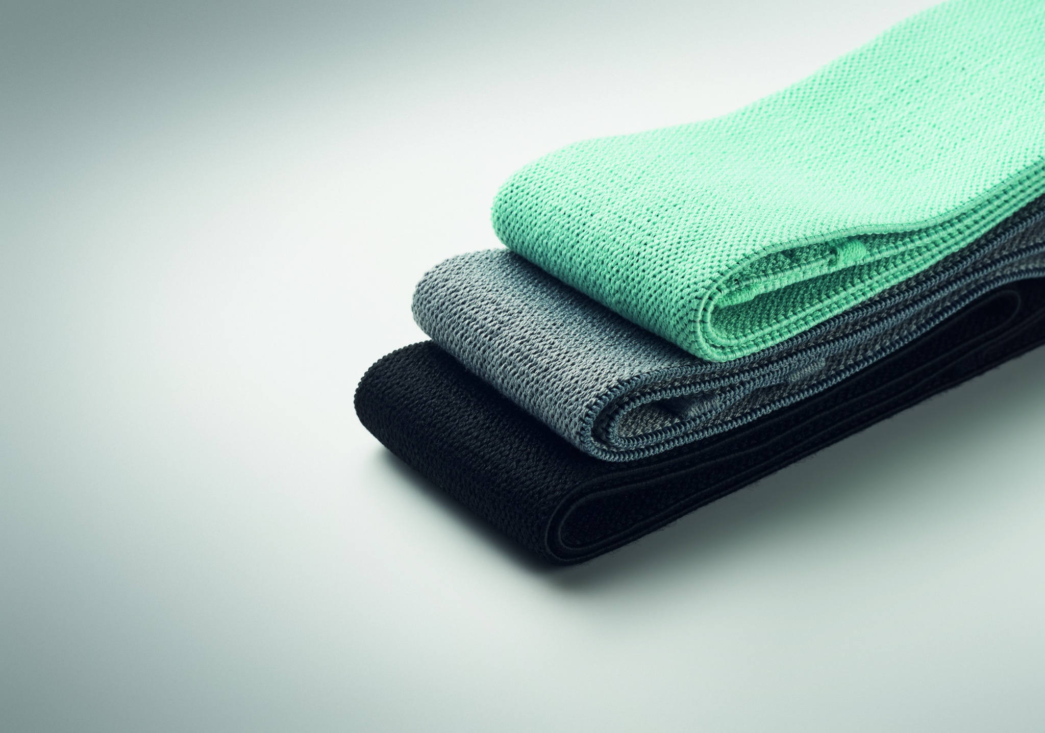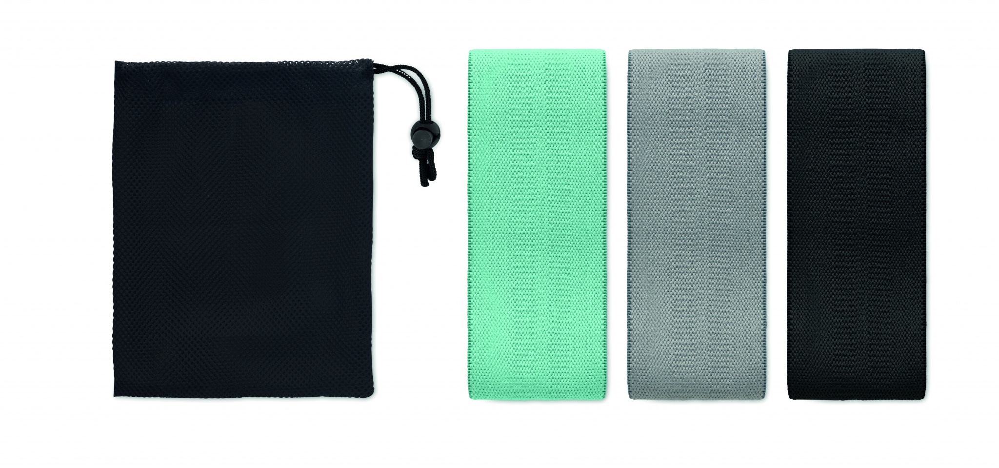 Набор из 3 фитнес лент из терилена, хлопка и латексного шелка в чехле из RPET. Все фитнес-ленты имеют разную силу растяжения для выбора оптимальной нагрузки.