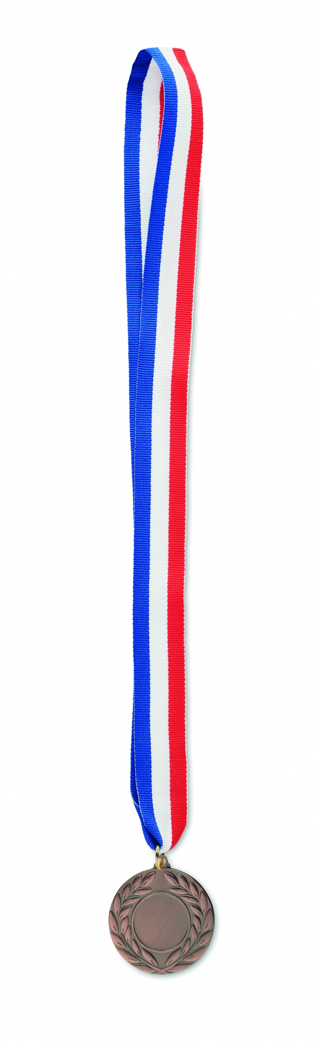 Железная медаль на трехцветной ленте из полиэстера (синего, белого и красного цветов). Диаметр 5 см