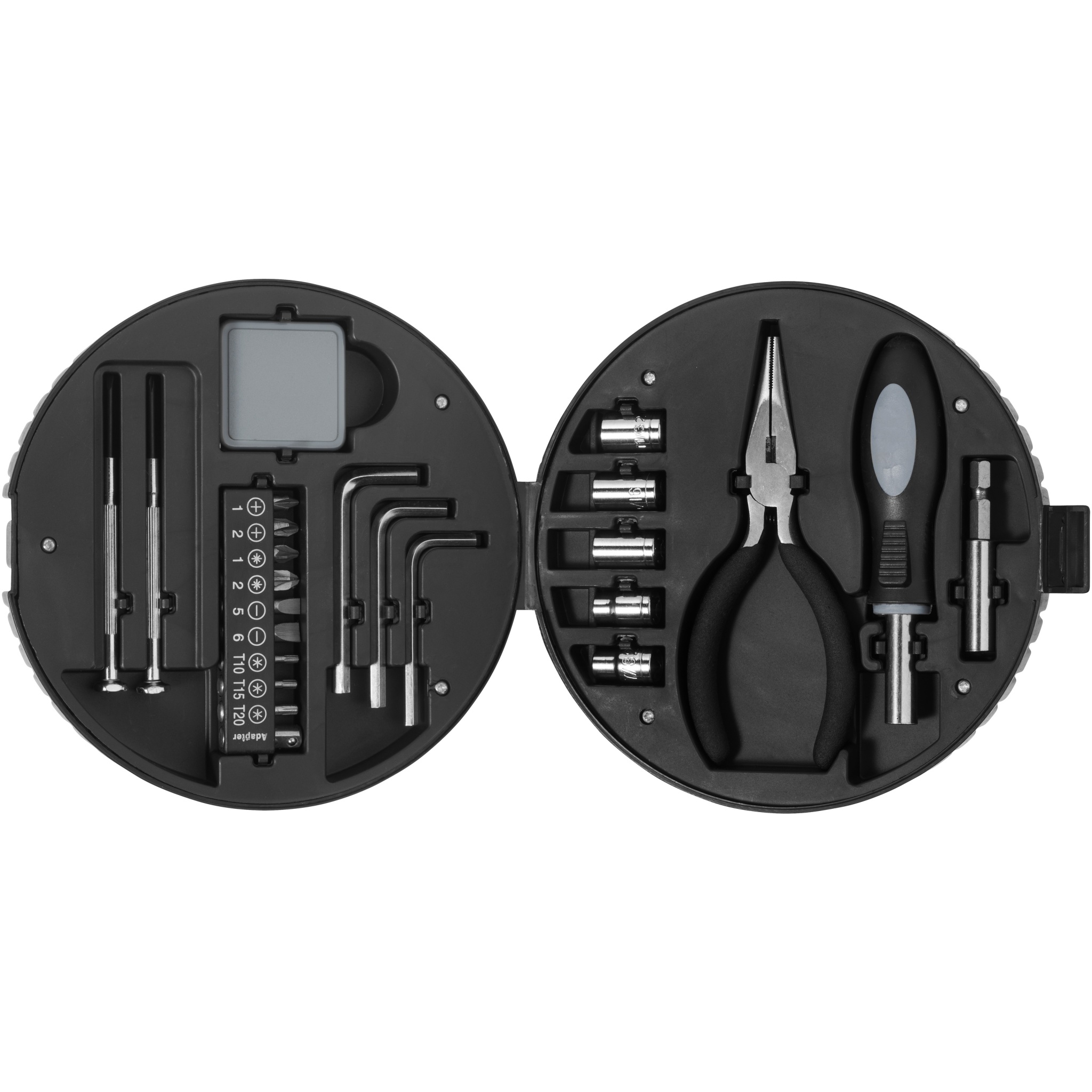 Набор из 25 инструментов включает измерительную минирулетку, крестообразную отвертку, плоскую отвертку, 9 насадок с адаптером (4 крестообразных шлицев, 2 плоских шлица и 3 шестигранных шлица), 3 шестигранных ключа, 5 головок (5-9 мм), острогубцы, рукоятку отвертки, адаптер для насадок и удобный футляр. Предлагается в подарочной коробке STAC. Эксклюзивный дизайн.