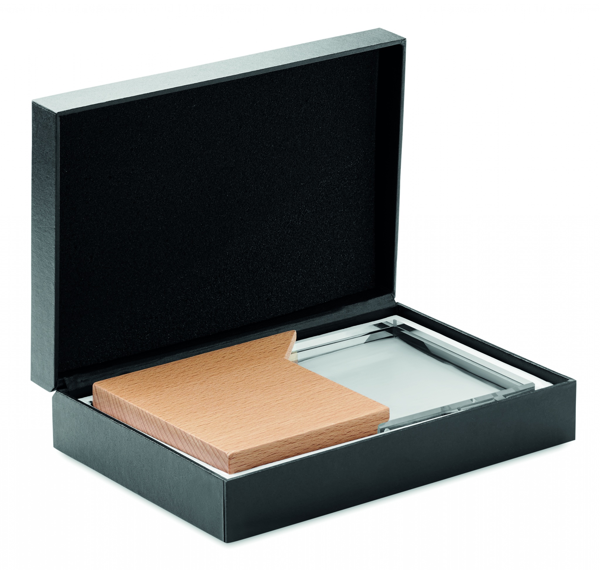 Хрустальная награда или наградная табличка на деревянном основании из бука в подарочной коробке.