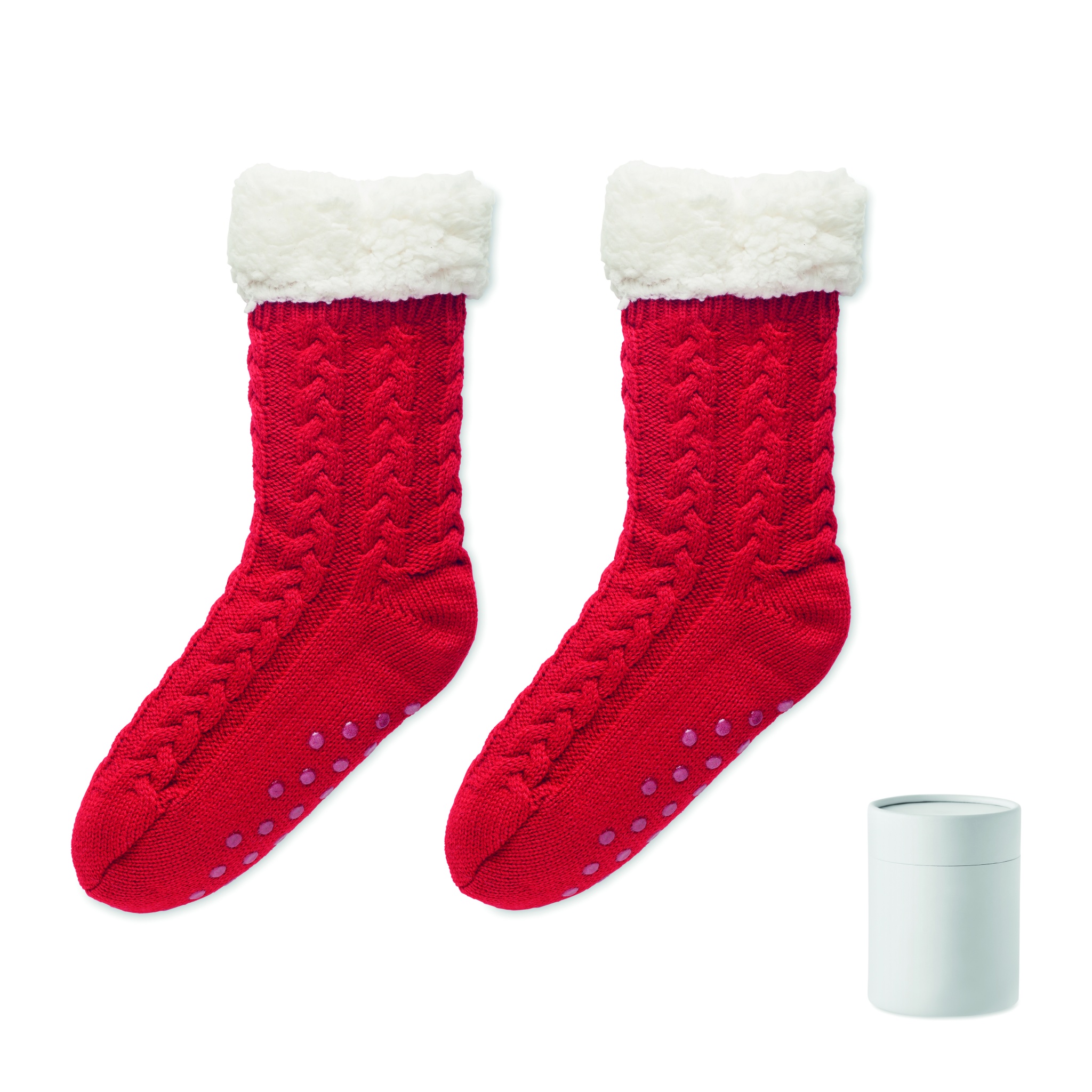 Вязаные носки с нескользящей подошвой из акрила и подкладкой из искусственной шерпы плотностью 240 гр/м². Поставляются в подарочной упаковке. Размер L= 40-43.