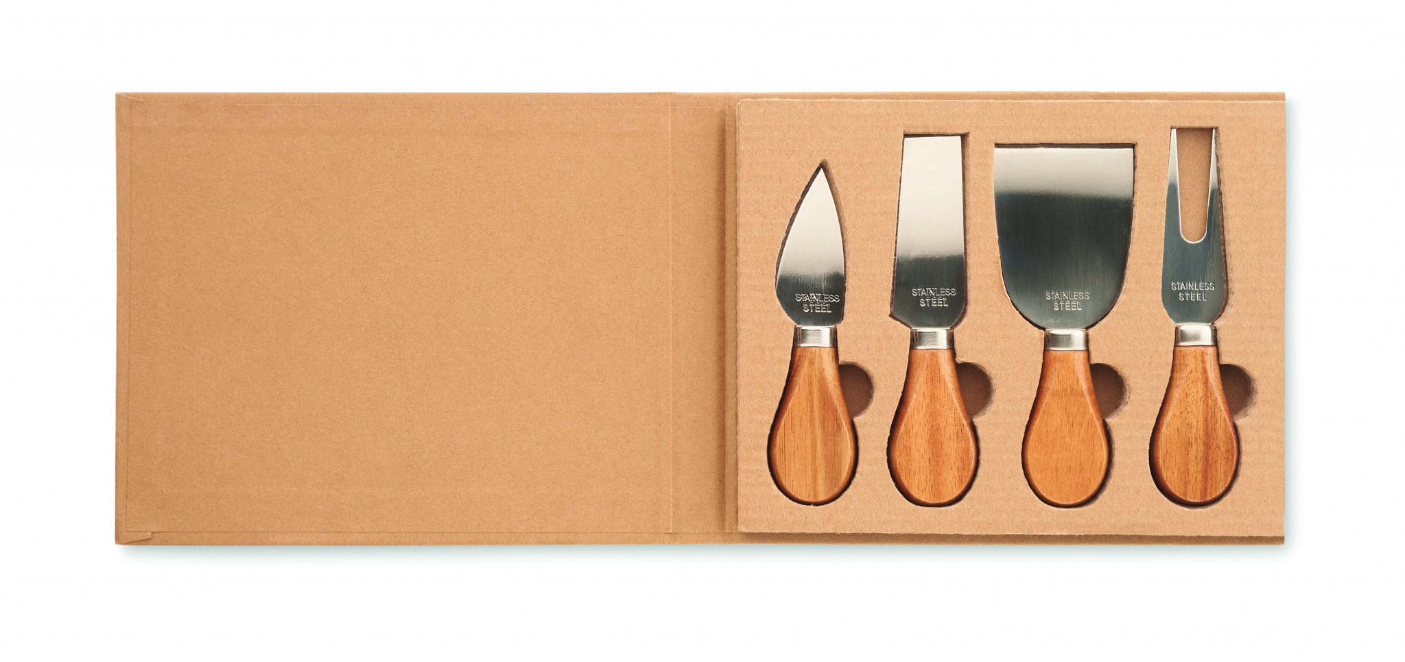 Набор из 4 ножей для сыра из нержавеющей стали с ручками из каучукового дерева. Представлен в подарочной коробке из гофрированного картона.