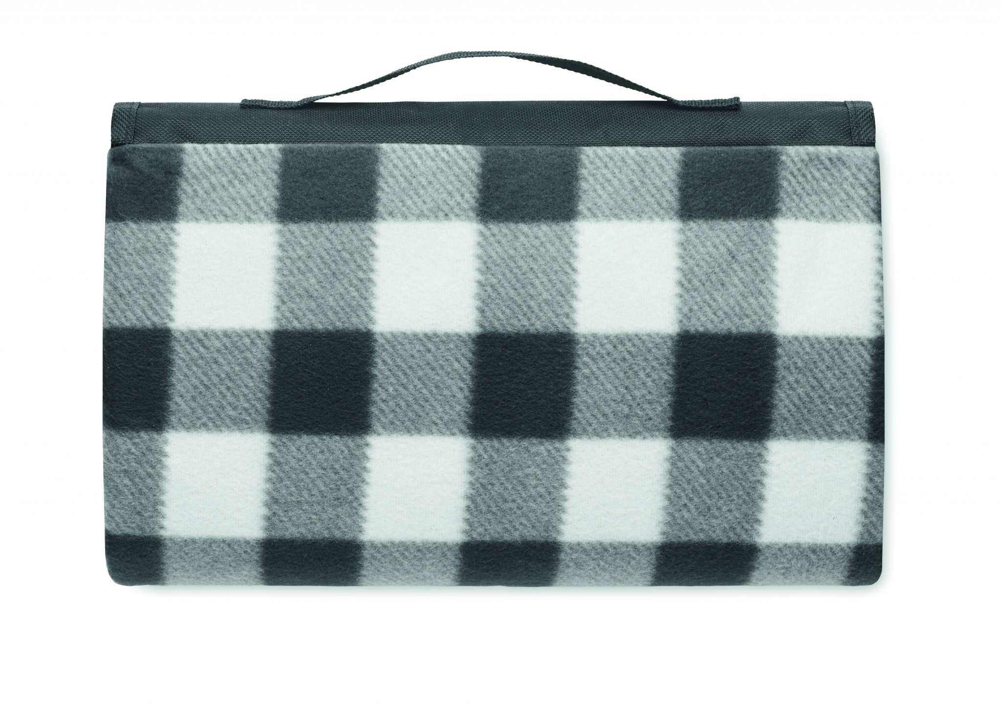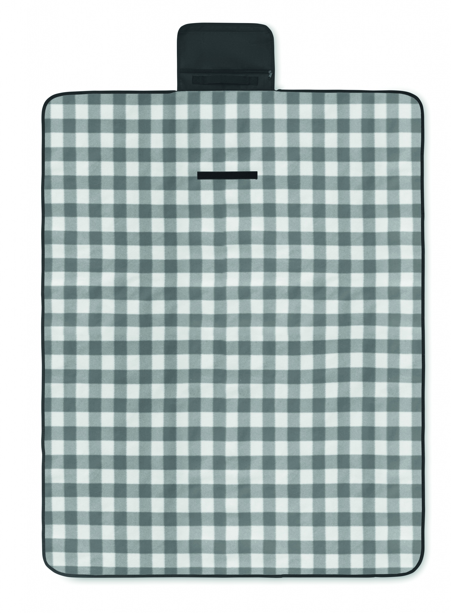 Складывающийся плед для пикника из флиса RPET 150 гр/м² с водостойким покрытием PEVA с обратной стороны. Включает передний карман на молнии и короткий ремень для переноски.