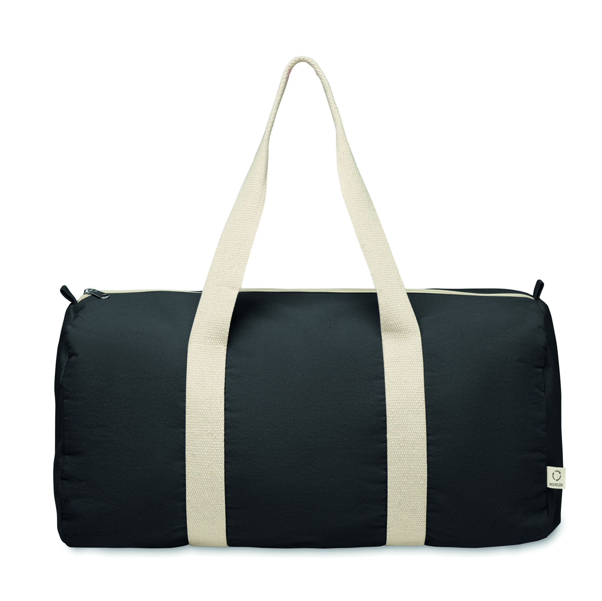 Duffle, sports or travel bag with zippered side compartment and zippered inner pocket in 320 gr/m² recycled cotton (80%) and recycled polyester (20%) with long handles.
