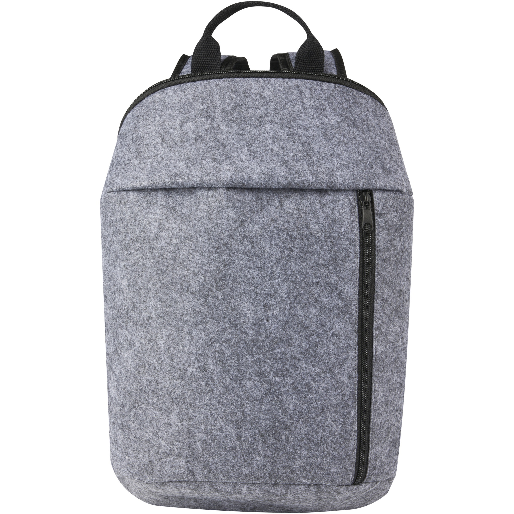 Практичный рюкзак-холодильник, изготовленный из высококачественного мягкого и прочного фетра, переработанного по стандарту GRS. Имеет основное отделение на молнии, отделанное высокоплотной термической PEVA-изоляцией, совместимой с пищевыми продуктами, позволяющей хранить напитки и закуски холодными на протяжении нескольких часов. Передний карман на молнии. Регулируемые наплечные ремни из хлопка и тканая ручка для переноски. Легко чистится. Емкость: 7 литров.