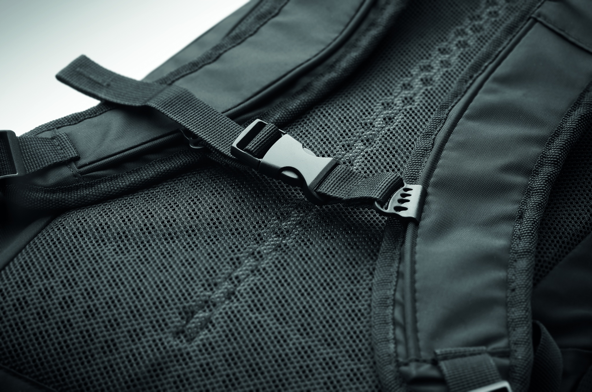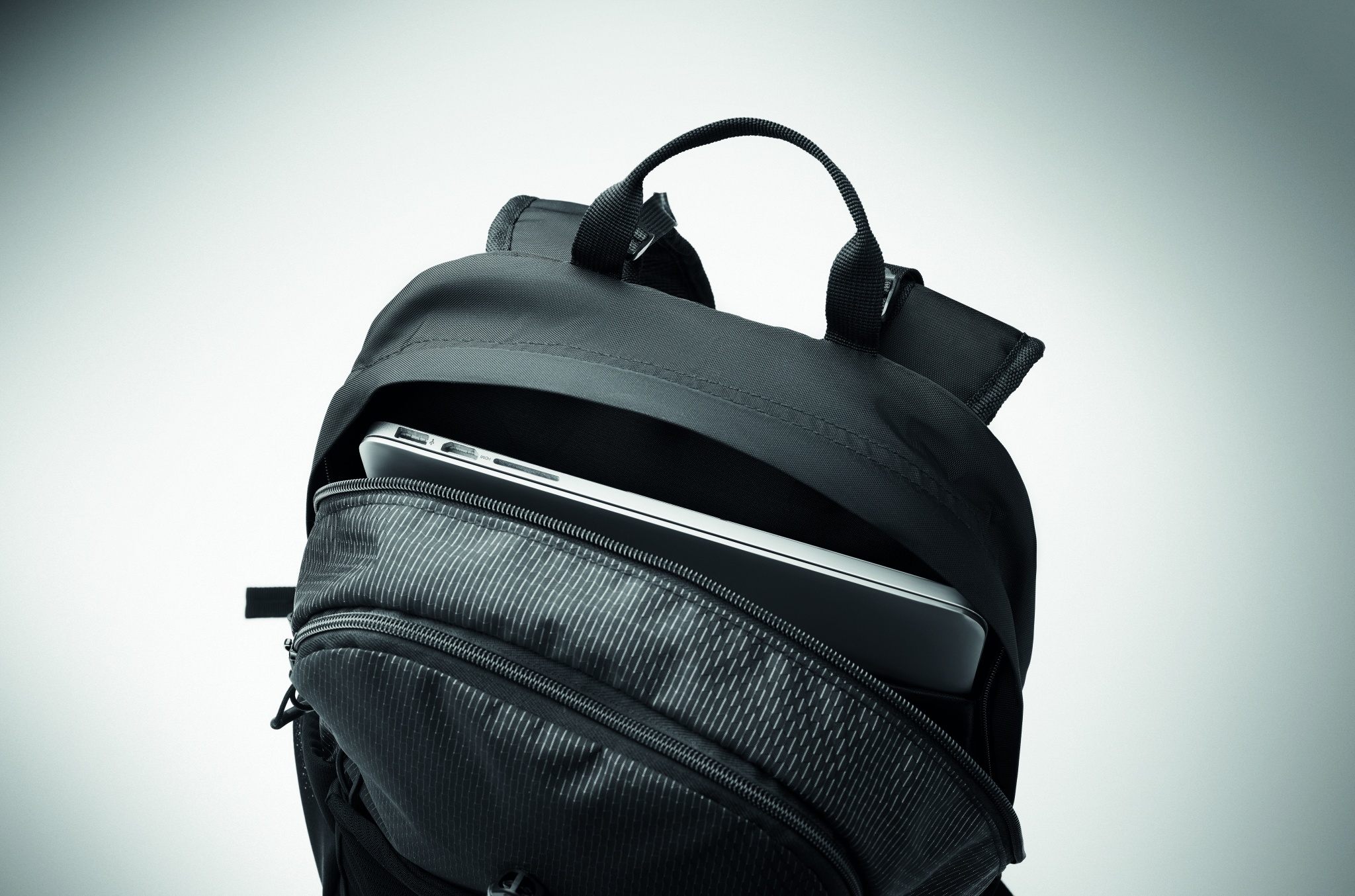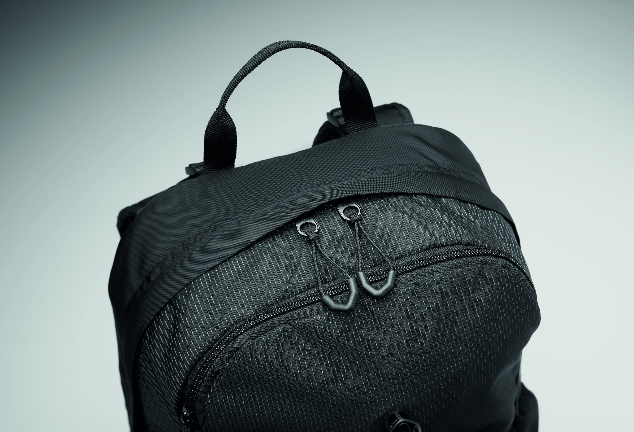 Походный рюкзак 18 л из водоотталкивающего нейлона 420D со светоотражающей полосой. Имеет внутреннее отделение для ноутбука 15 дюймов. Одно переднее отделение на молнии и один передний карман с застежкой-пряжкой. Два боковых кармана. Мягкая спинка и плечевые ремни. Вентилируемая задняя часть.