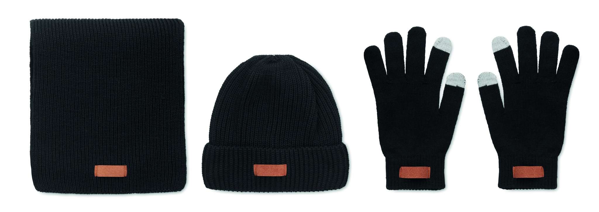 Зимний комплект из 3 предметов. Включает в себя шапочку из переработанного материала, шарф и тактильные перчатки с нашивкой для нанесения.