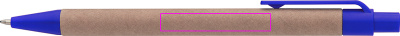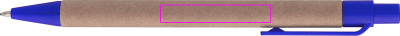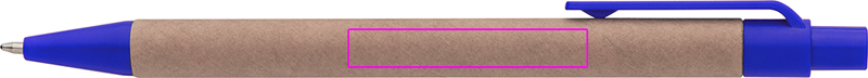 Шариковая ручка из переработанной бумаги и цветных пластиковых аппликаций, синие буквы. Ваш логотип напечатан справа от зажима.
