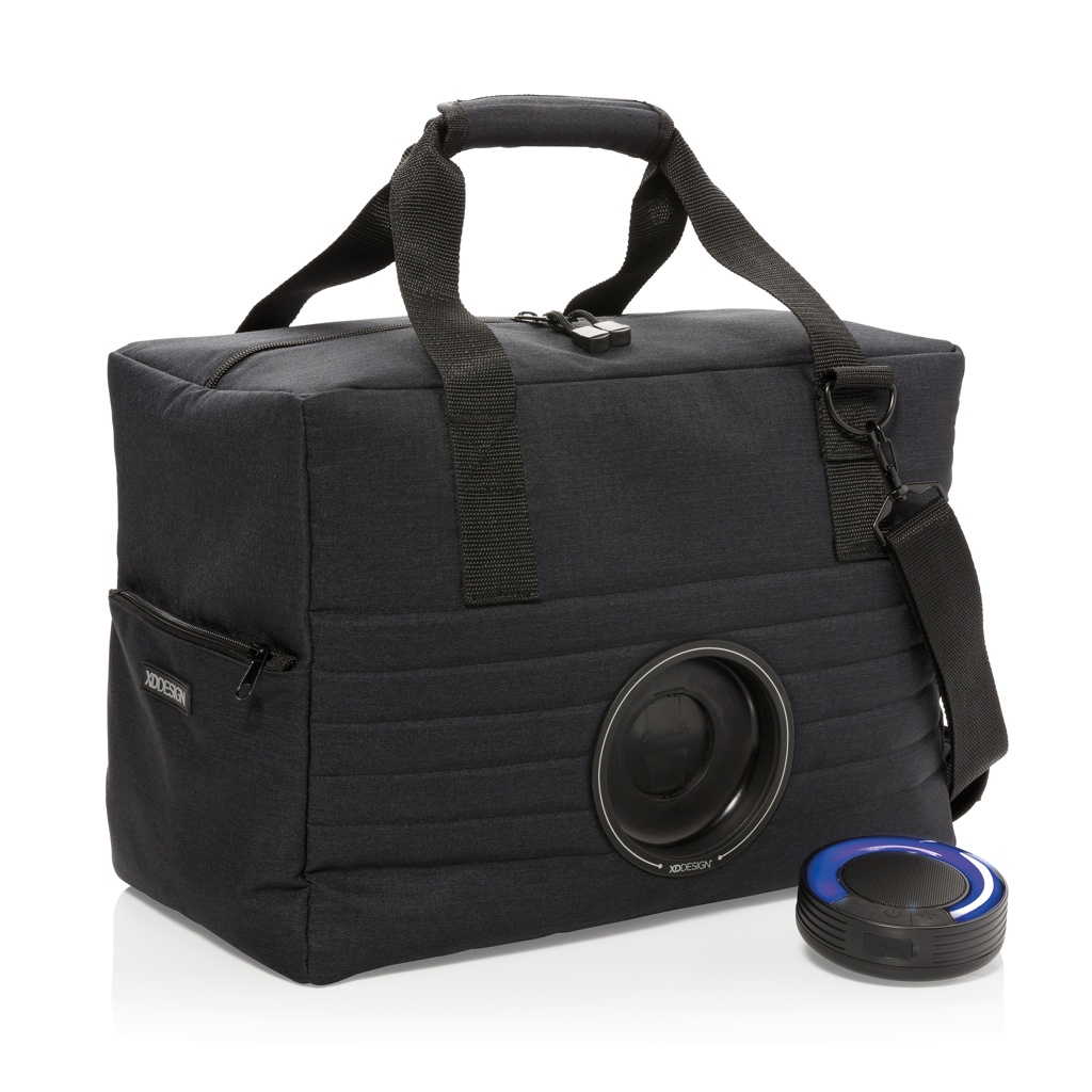 Большая стильная сумка-холодильник со съемным водонепроницаемым беспроводным динамиком IPX5 с меняющим цвет светодиодом. Просто поверните, чтобы вынуть динамик и положить его на стол. До 5 часов воспроизведения. Вмещает до 32 банок. Включает плечевой ремень. Зарегистрированный дизайн®