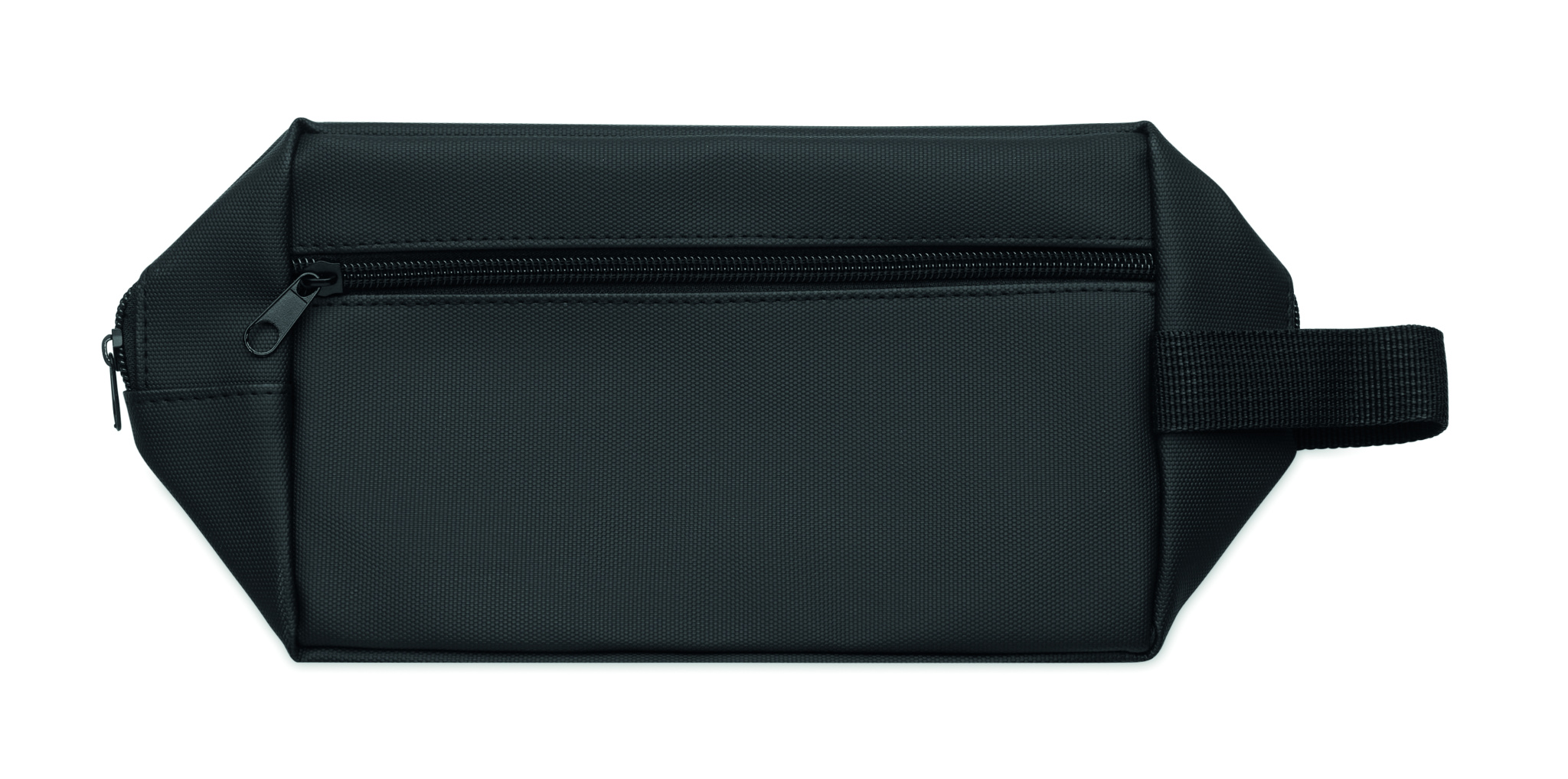 Toiletry bag made of 600D RPET polyester with PU coating and 210D RPET lining. Features zippered front pocket and handle.