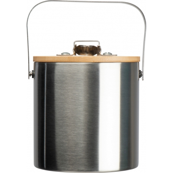 Ведерко для льда из нержавеющей стали с двойными стенками, ручкой для переноски, бамбуковой крышкой, захватом и емкостью наполнения 1200 мл. Ваш логотип будет выгравирован лазером на ведре.