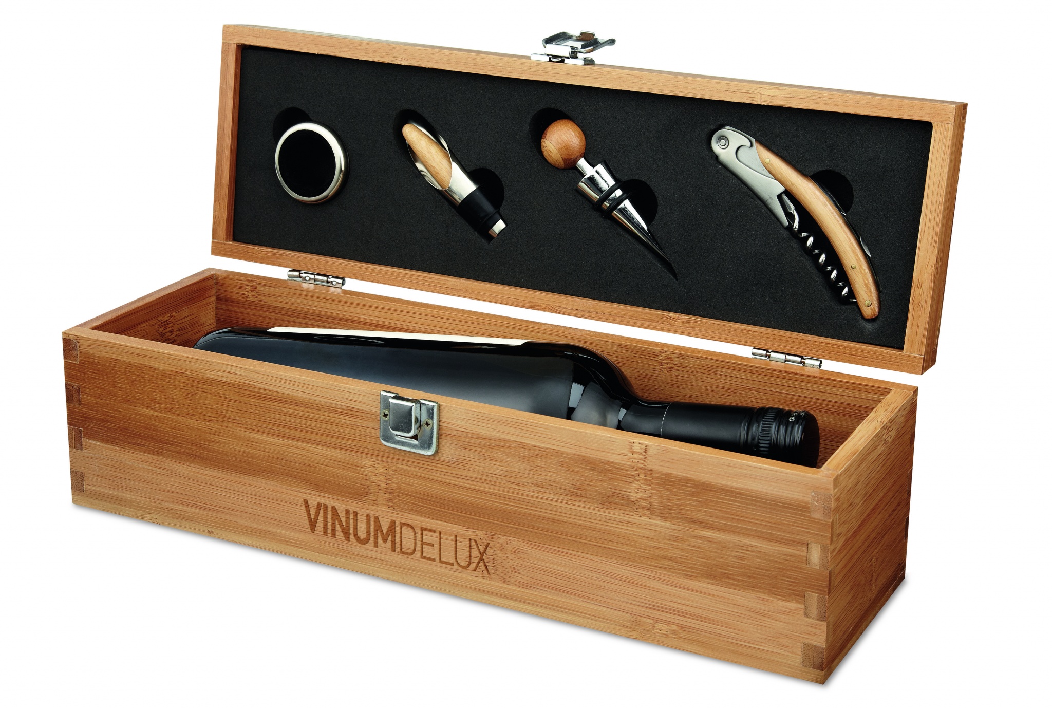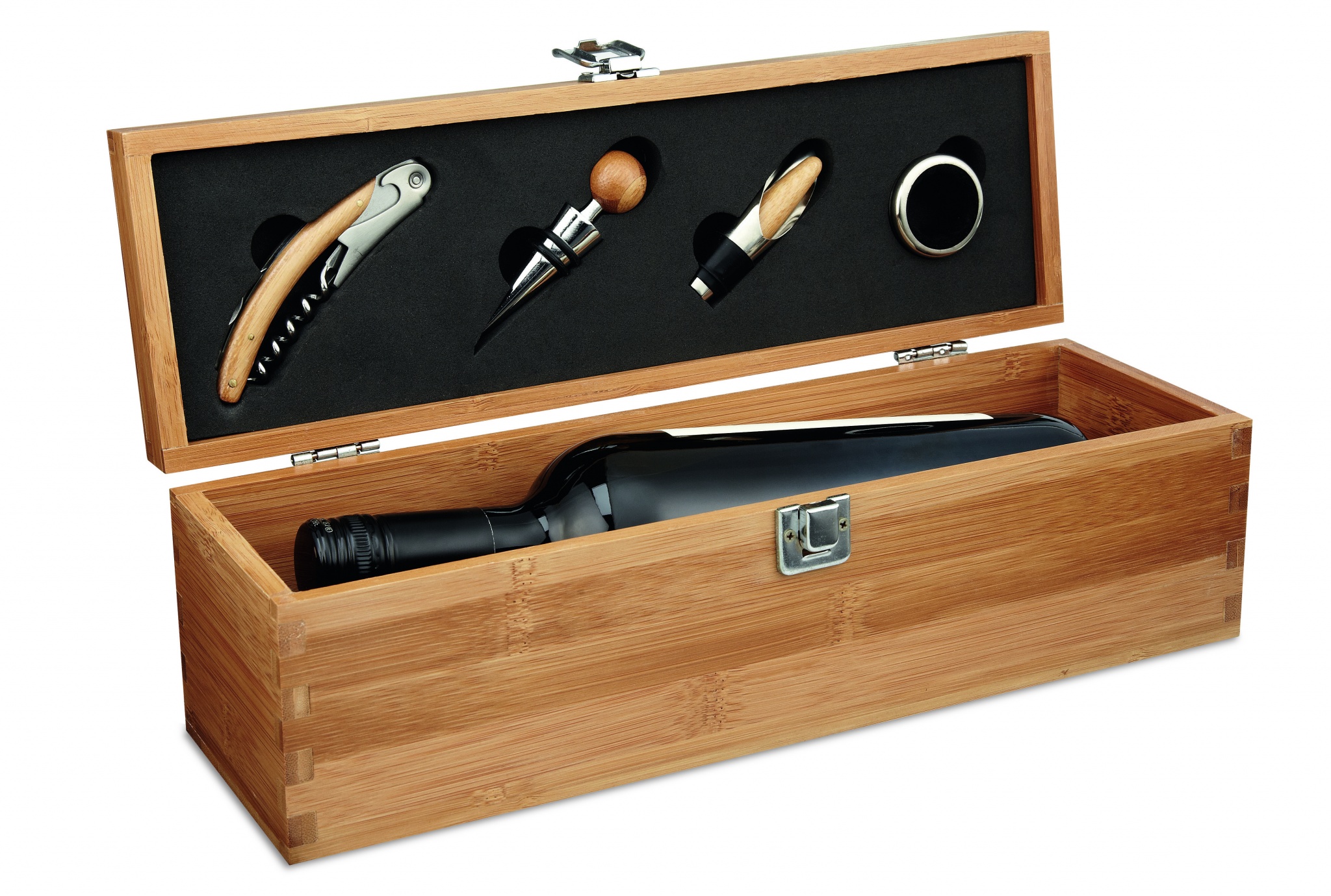 Набор винных инструментов в бамбуковой коробе для одной бутылки вина.