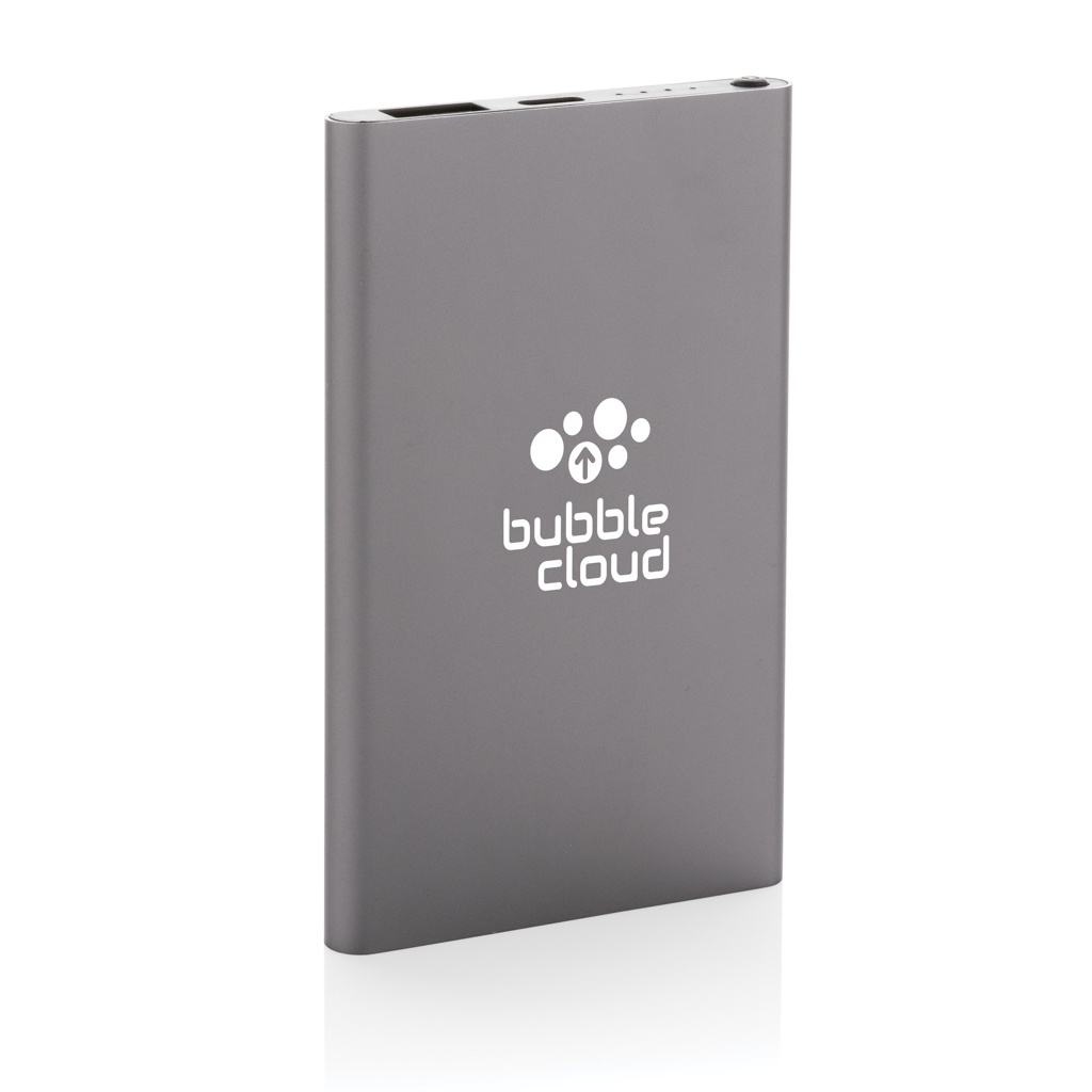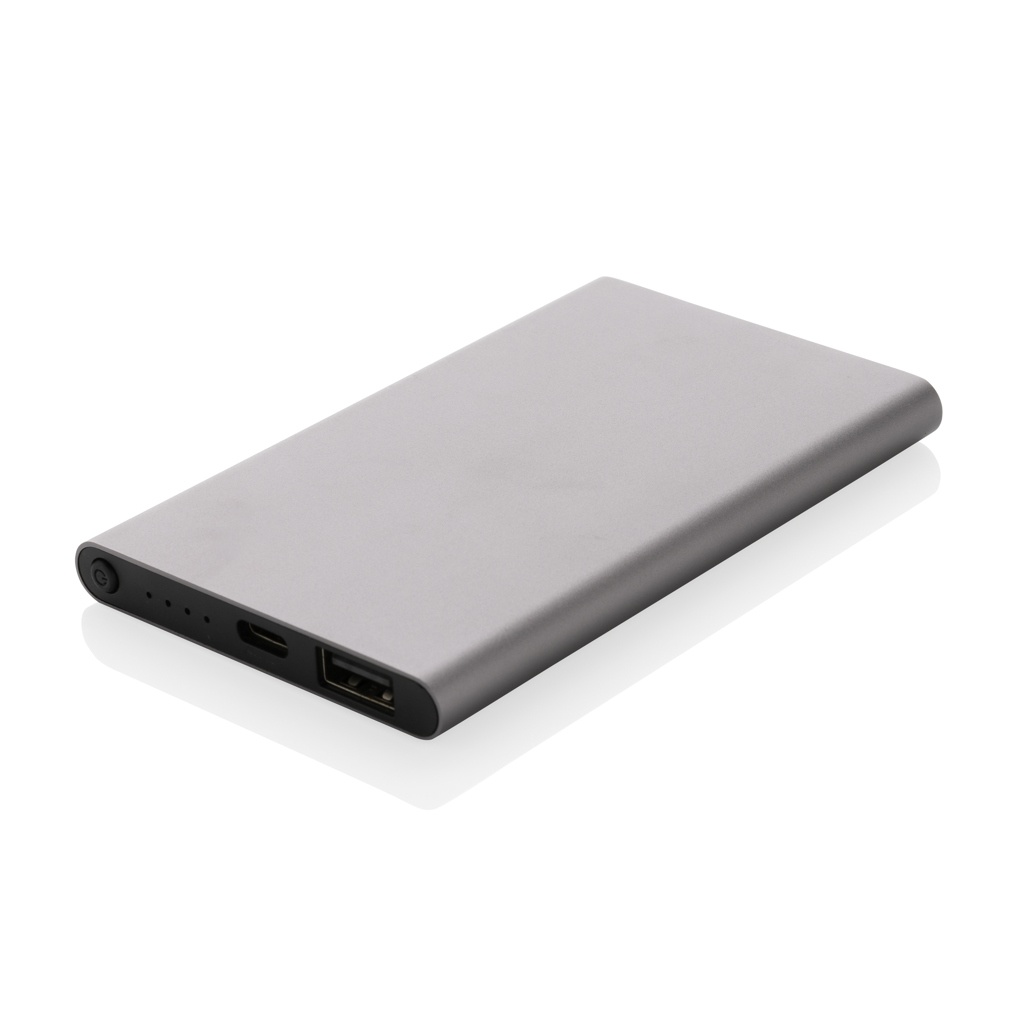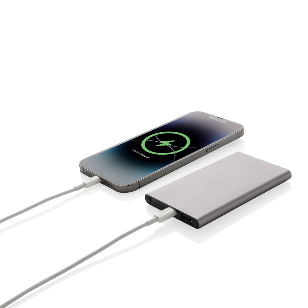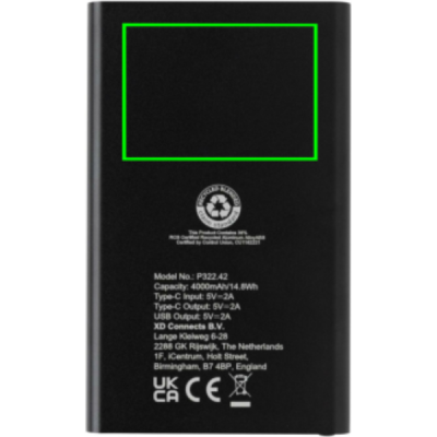 Powerbank с плоским дизайном емкостью 4000 мАч с корпусом из сертифицированного RCS переработанного алюминия/ABS-пластика. RCS (Recycled Claim Standard) — это стандарт для проверки переработанного содержимого продукта по всей цепочке поставок. Общее содержание переработанного содержимого: 36 % от общего веса товара. Powerbank поддерживает зарядку как через USB A, так и через тип C. Powerbank содержит долговечную литий-полимерную батарею класса A емкостью 4000 мАч. Индикаторы питания покажут оставшийся уровень энергии, поэтому вы всегда будете знать, когда следует подзарядить.; Вход Type-C 5 В/2 А; Выход Type C: 5 В/2 А Выход USB A: 5 В/2 А. Товар и аксессуары не содержат ПВХ. В комплект входит сертифицированный RCS переработанный зарядный кабель TPE. Упаковано в упаковку FSC® mix.
