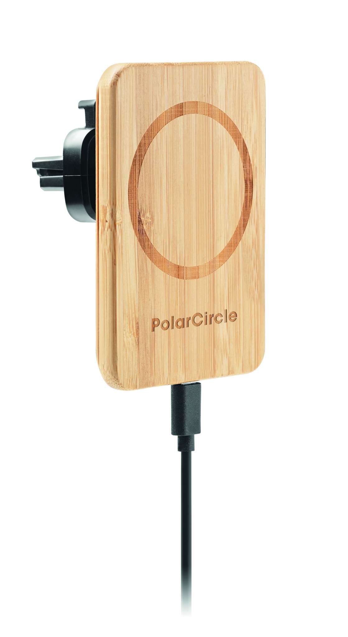 Магнитное беспроводное зарядное устройство из бамбука с креплением для автомобиля. Выход: DC 9V/1.67A (15W) для быстрой зарядки. Совместимо с iPhone® 12 и новее. В комплект входит дополнительное магнитное металлическое кольцо для удержания немагнитных устройств с беспроводной зарядкой.