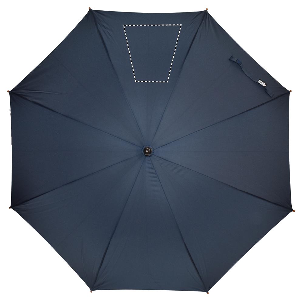Зонт трость размером 23,5 дюйма. Материал эпонж 190T RPET. Каркас и ручка деревянные. Спицы черные металлические. Ручное открытие.