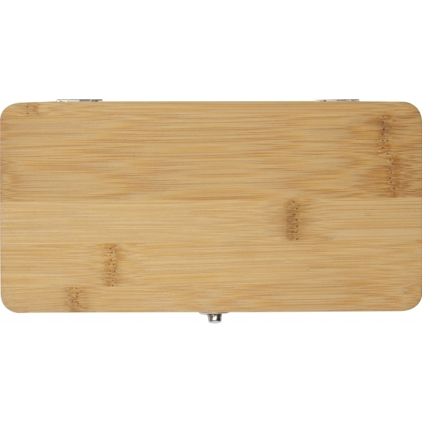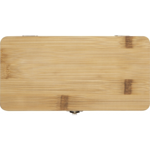 22-delat verktygsset bestående av 3 skruvmejslar, olika bits med adapter, samt en fräs och 4 sexkantnycklar i bambufodral. Din logotyp kommer att graveras på fodralet.