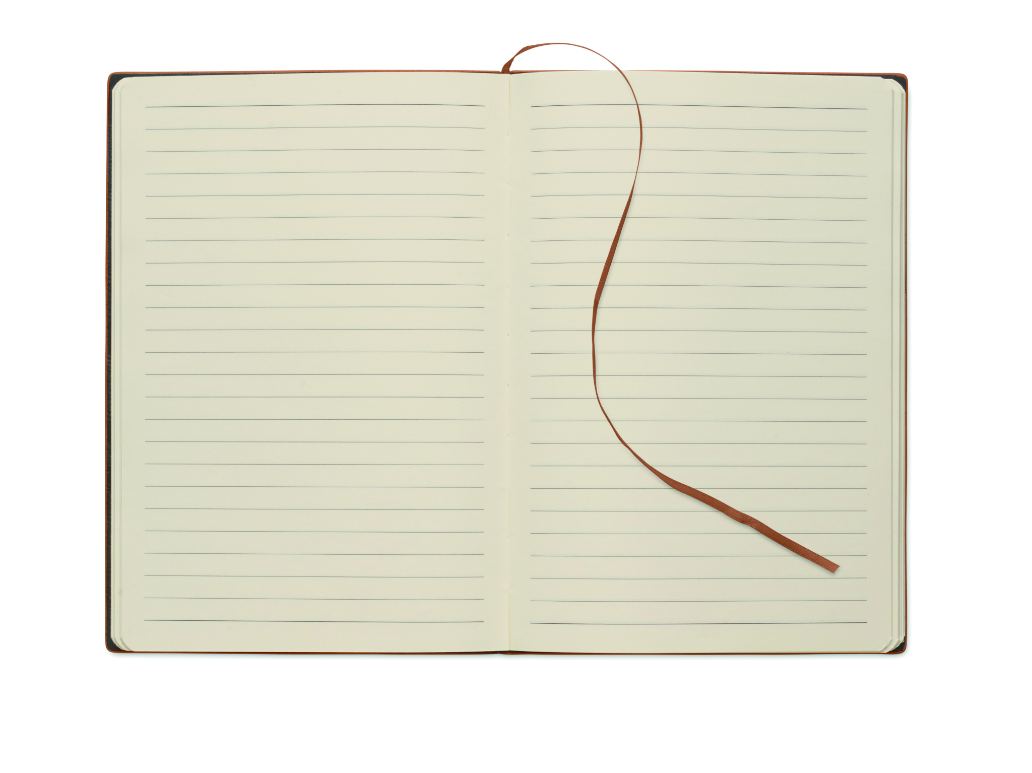 A5 anteckningsbok med mjukt, räfflat PU-omslag i 40% återvunnen och 60% PU med slät PU-lapp. 160 linjerade sidor, 70 gsm återvunnet papper (80 ark). Sidmarkör i matchande färg med polyesterband.