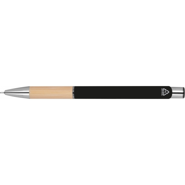 Semi gelpenna gjord av återvunnet aluminium med en yta i gummi. Den har också en bambugreppzon, en blåskrivande plastpåfyllning (0,5 mm spets) och silverdetaljer.