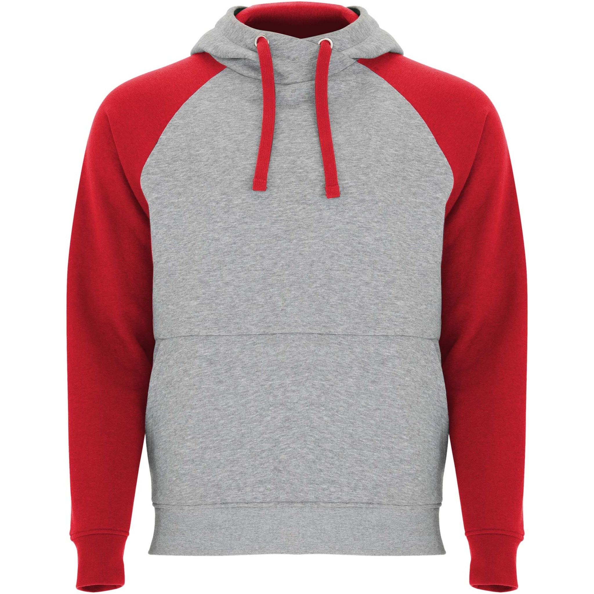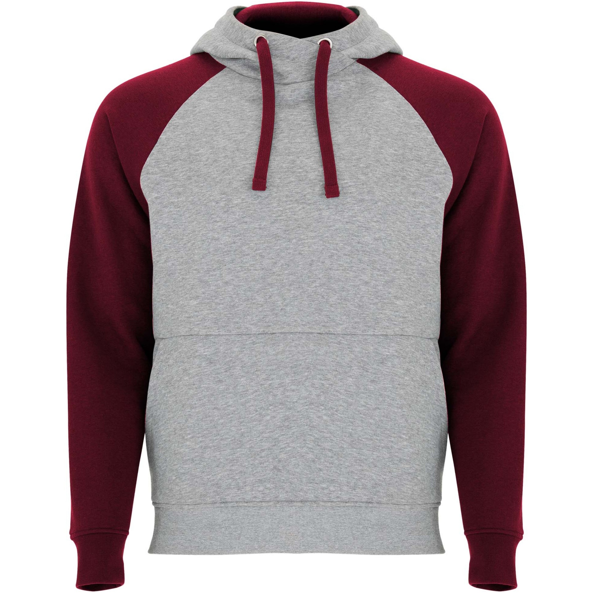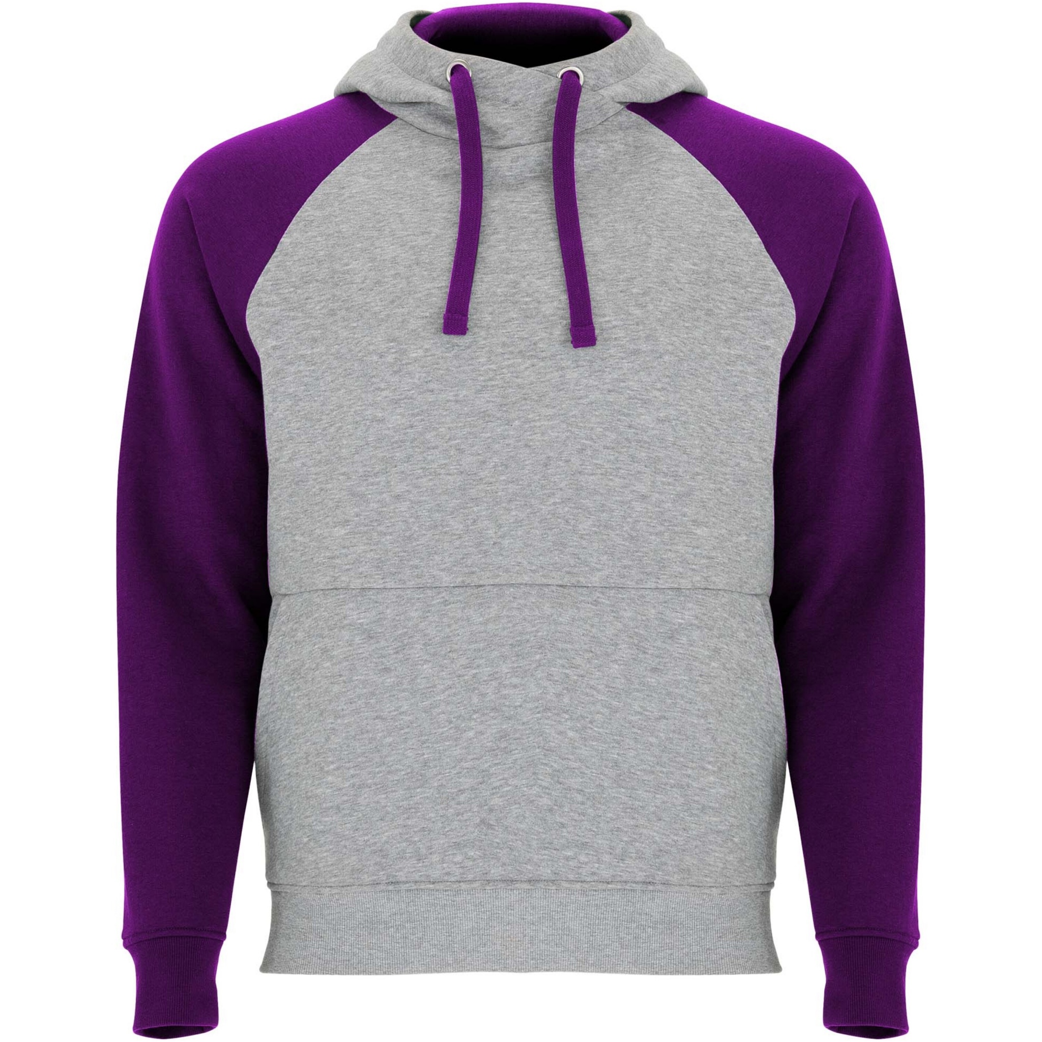 Tvåfärgad unisexhuvtröja. Huva med korsad hals och metallöglor. Kontrasterande innerhuva, dragsko och raglanärmar. Känguruficka. Muddar och fåll i ribbstickad 1 x 1 elastan. Avtagbar etikett.