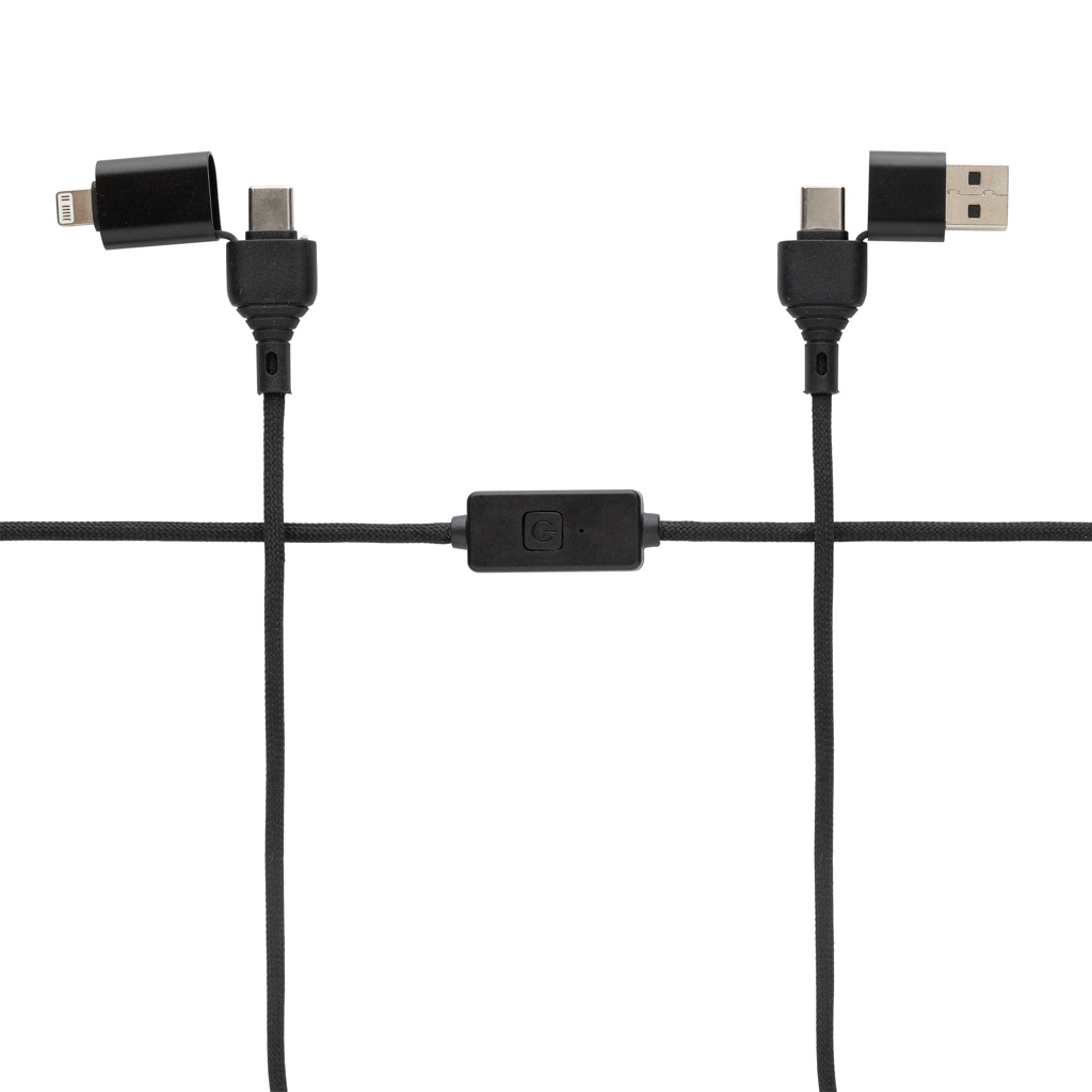 60W laddnings- och datakabel som kan ladda alla dina mobila enheter med högsta hastighet och även stöder laddning av laptops. Kabeln har en unik integrerad knapp som stänger av dataöverföringsfunktionen när kabeln används offentligt för att undvika datastöld eller att hackare kommer åt din telefon. Tryck bara på knappen för att aktivera skyddsläget. Kabeln är tillverkad av återvunnen TPE, PET, ABS och återvunnen aluminium. 120 CM lång och stödjer Car play och Android auto (endast type C till type C). Totalt återvunnet innehåll: 52% baserat på total produktvikt. RCS-certifiering säkerställer en helt certifierad leveranskedja för återvunnet material. Levereras i FSC-mix förpackning. PVC-fri.