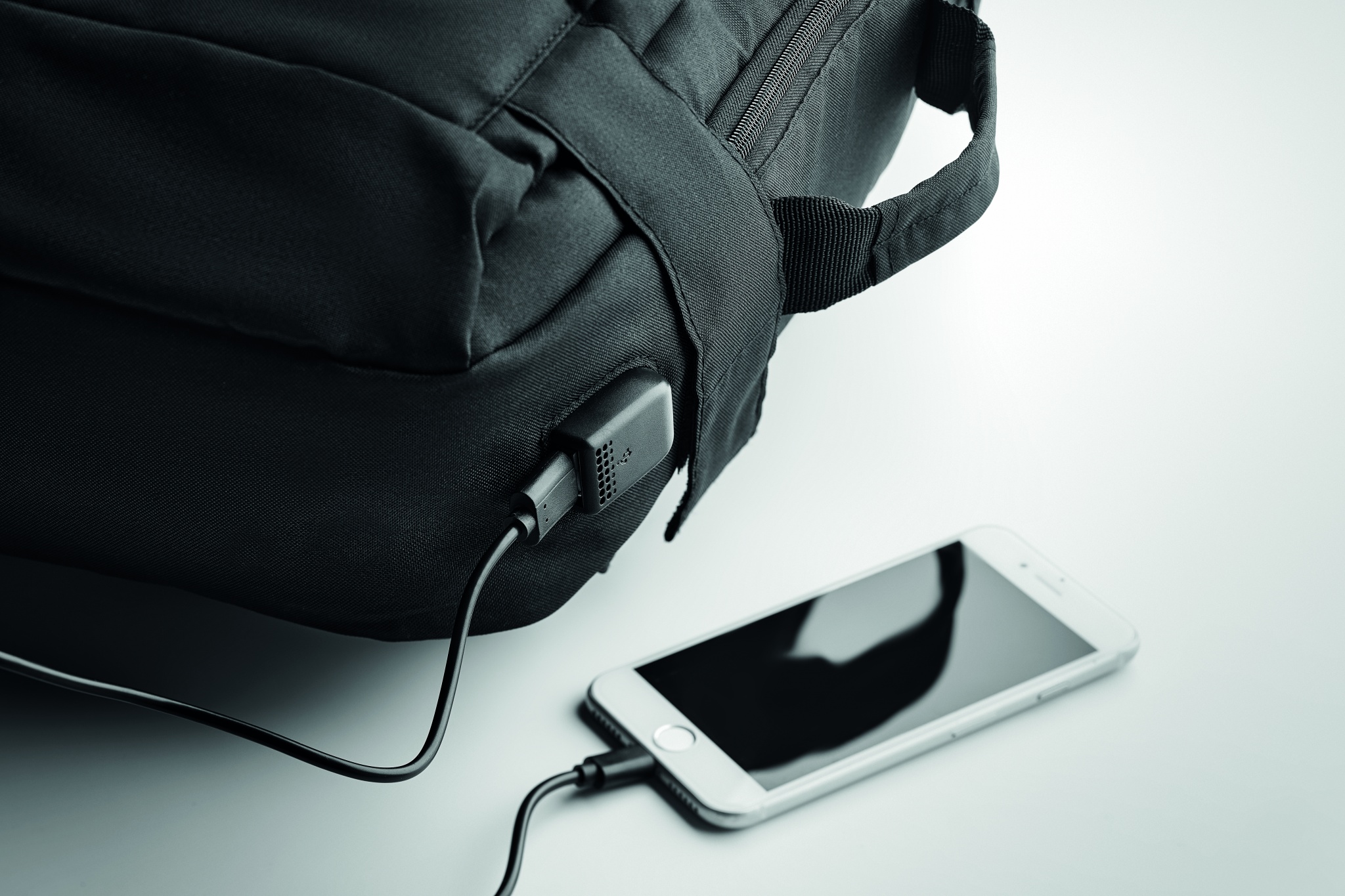 Datorryggsäck i 300D RPET polyester inklusive USB typ A-kontakt och kabel för laddning av mobila enheter. Denna kompakta ryggsäck är perfekt för resor och arbete eftersom du kan ta med dig en 16-tums bärbar dator eller surfplatta i det speciella facket. De olika facken är tillräckligt stora för att förvara kontors- och researtiklar eller andra föremål för daglig användning. Bakfacket har en metallkrok och D-ring i silverfärg, samt en liten ficka med dragkedja på axelremmen. Sidofacket har en USB-kontakt med en kabel på insidan av väskan. Du kan ansluta en powerbank (ingår ej) till den här kabeln så att du kan ladda din smartphone när du är på språng utan att behöva lägga den i väskan. Ryggsäcken i återvunnen PET-väskan är lätt och väger endast 391 gram när den är tom. Mått: 28x42x12cm (ca 14l volym)