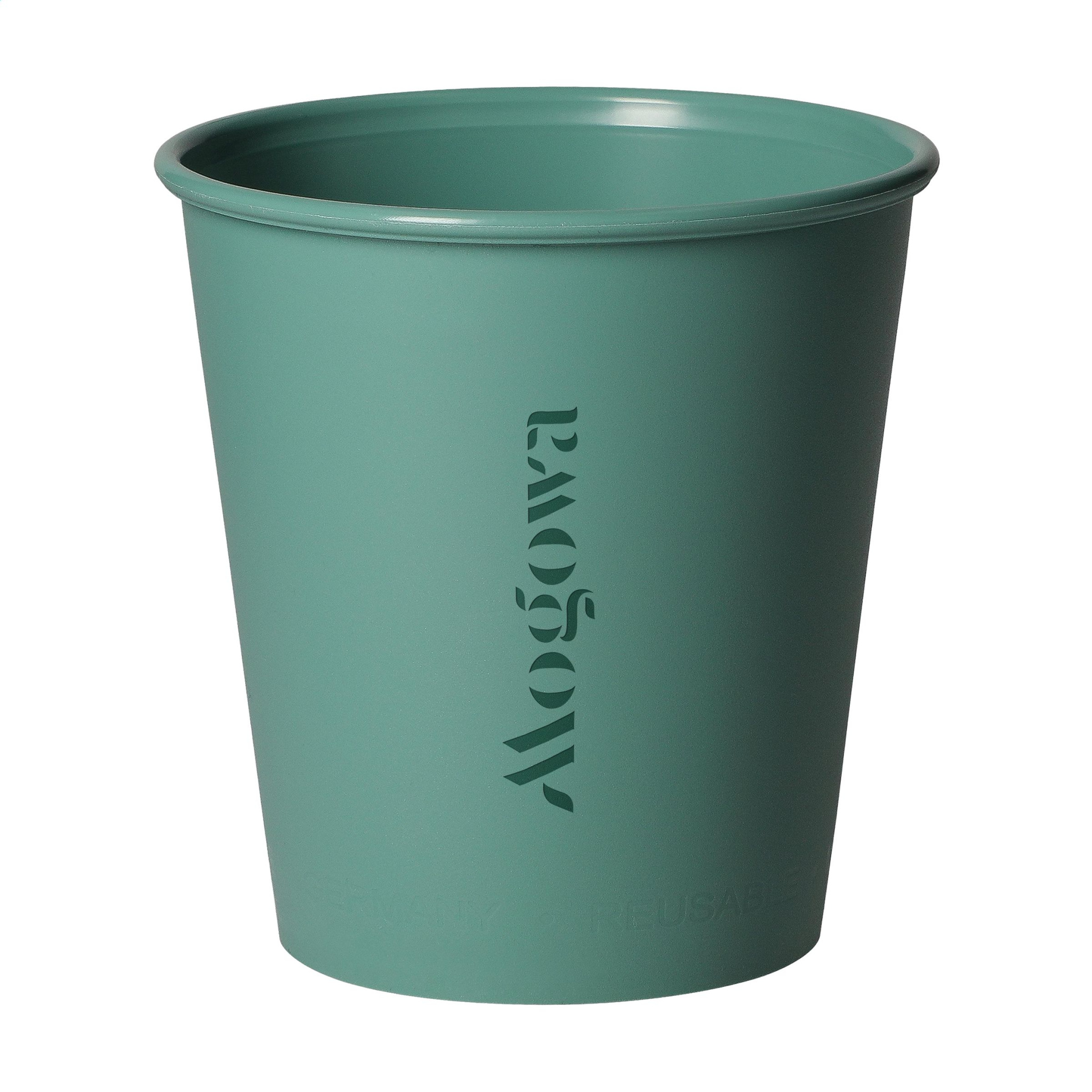Återanvändbar drickskopp gjord av biobaserat material från förnybara källor. Denna stapelbara kopp är ett bra alternativ till engångskaffekoppen. Passar under nästan vilken kaffemaskin som helst. 100 % återvinningsbar och BPA-fri. Denna produkt tål diskmaskin. Handtvätt rekommenderas för att bevara avtrycket. Kapacitet 200 ml. Tillverkad i Tyskland.