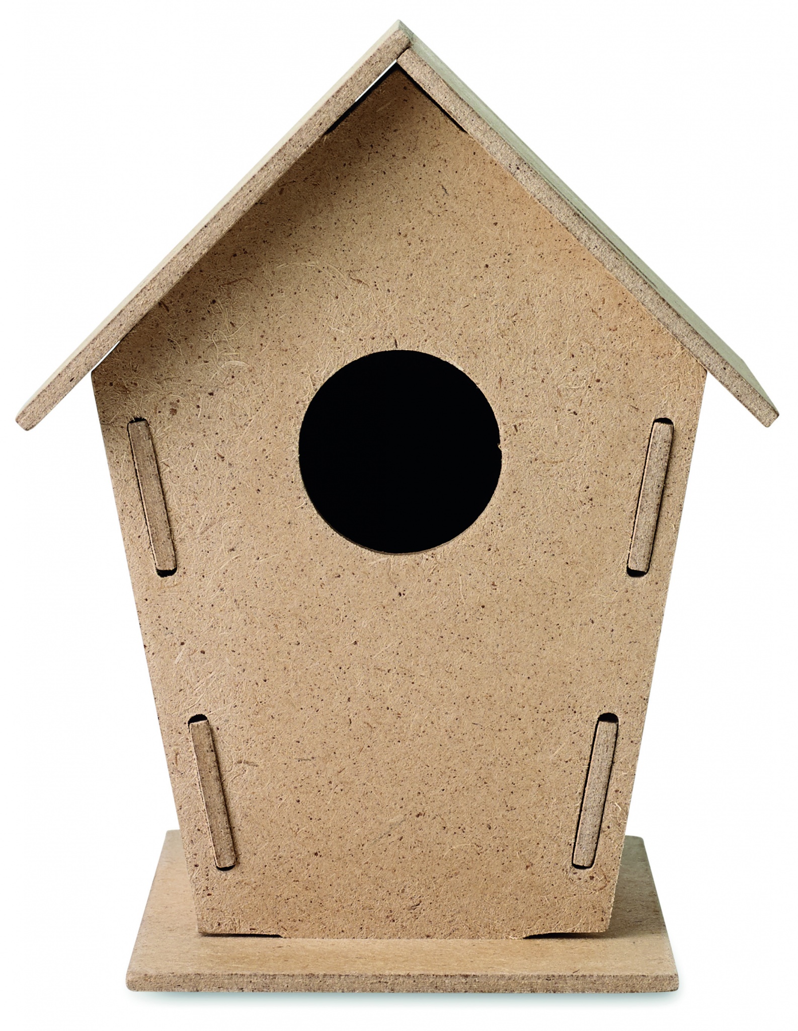 Bygg din egen fågelholk. Tillverkad av MDF. Kommer platt förpackad för enkel distribution och byggs sedan ihop av mottagaren. Trevlig miljövänlig kampanjartikel som passar flytt-, mäklar-, fastighets- och byggföretag.
