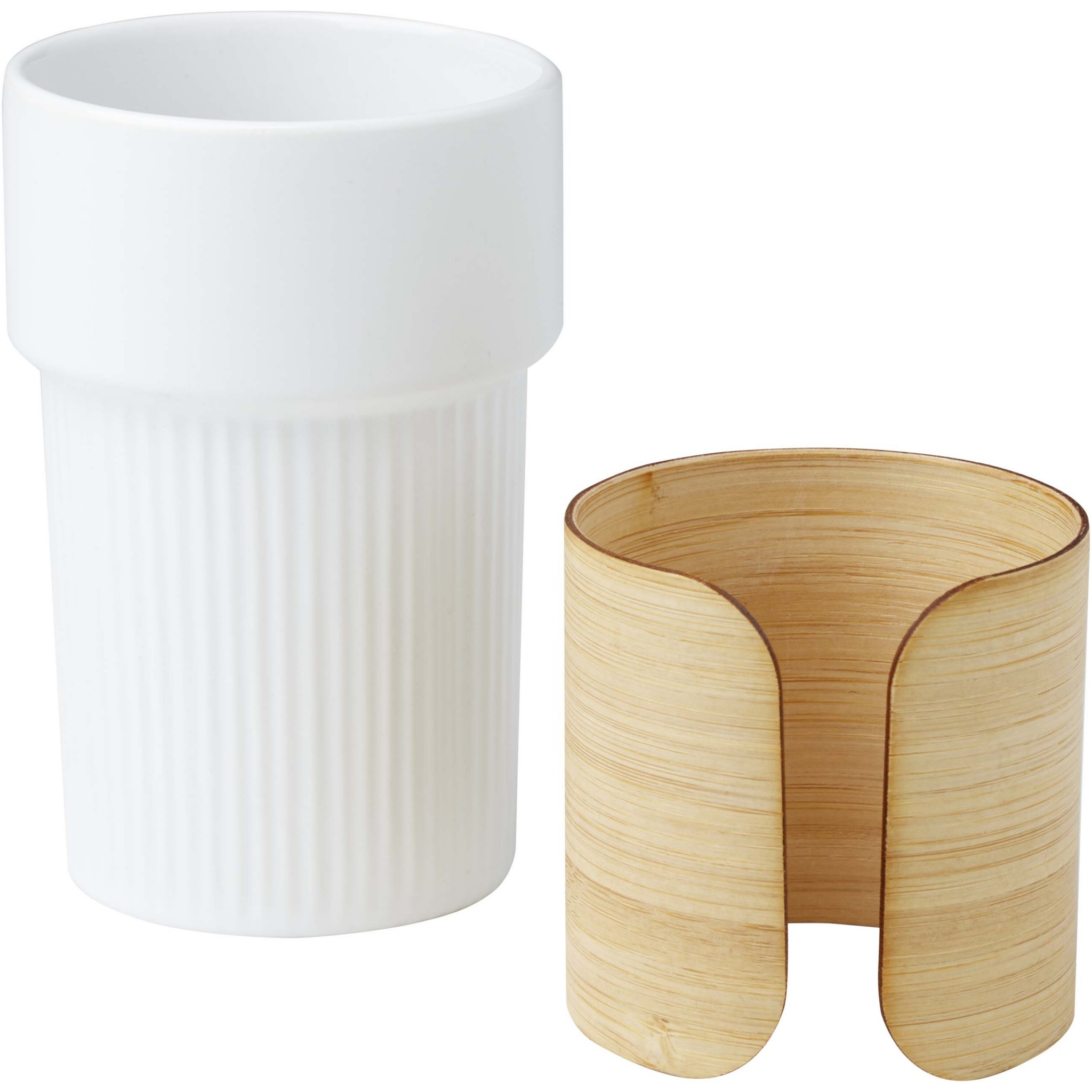 Den snygga keramiska muggen Fika har ett avtagbart bambugrepp som är perfekt att använda när du dricker varma drycker. Bambun som används kommer från hållbara, miljömässigt och socialt ansvarsfulla källor. Volymkapacitet: 340 ml. Levereras i en förpackning av återvunnen kartong.
