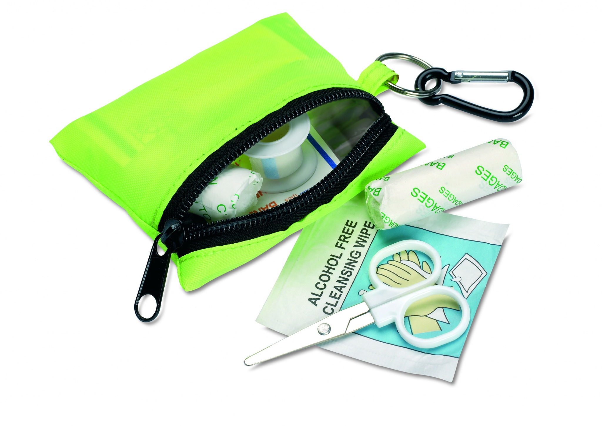 Förstaförband kit innehållande sax, en våtservett, en gasbinda, 3 bomullpads och 5 plåster. Packat i polyester påse med karbinhake.