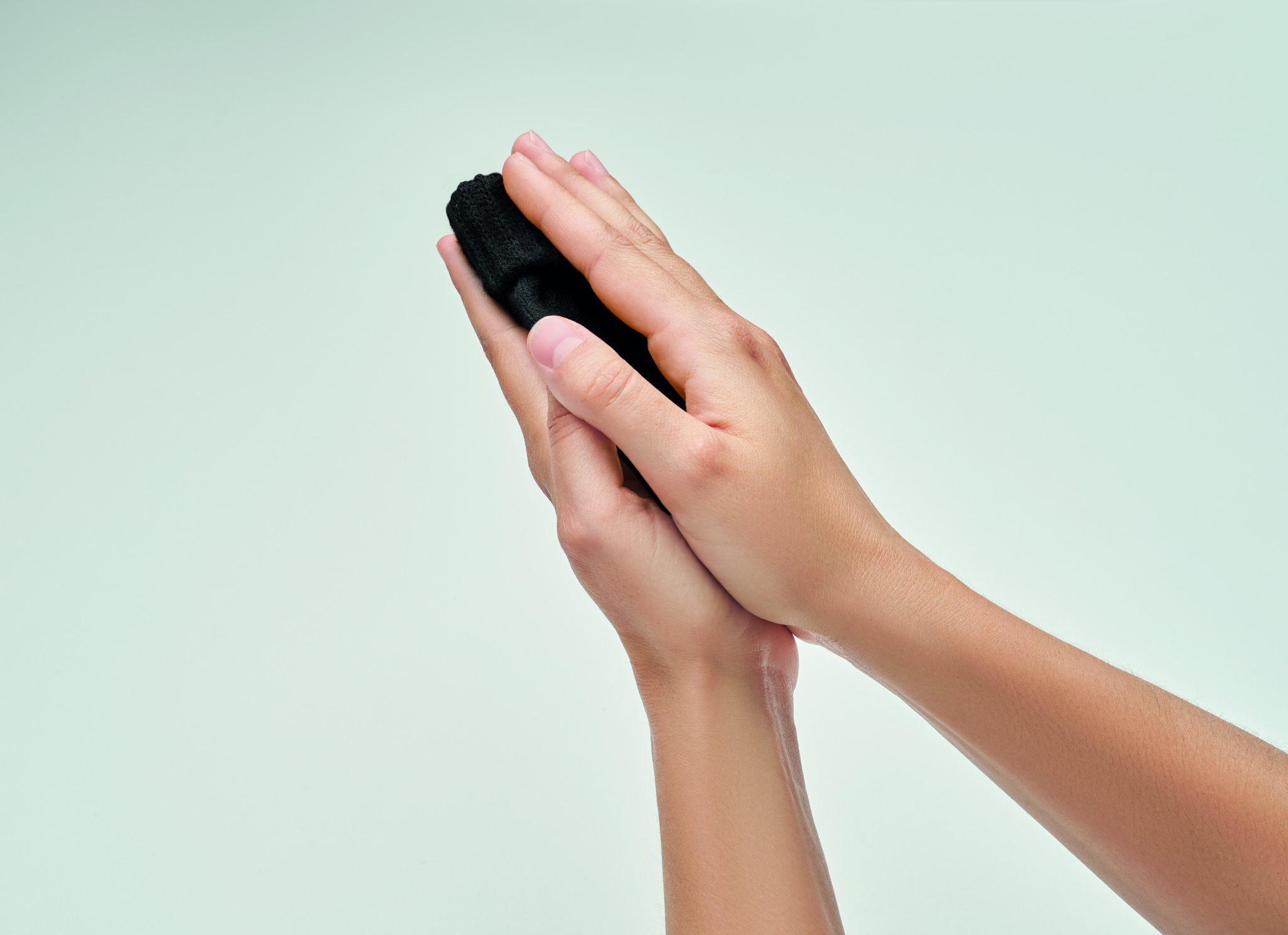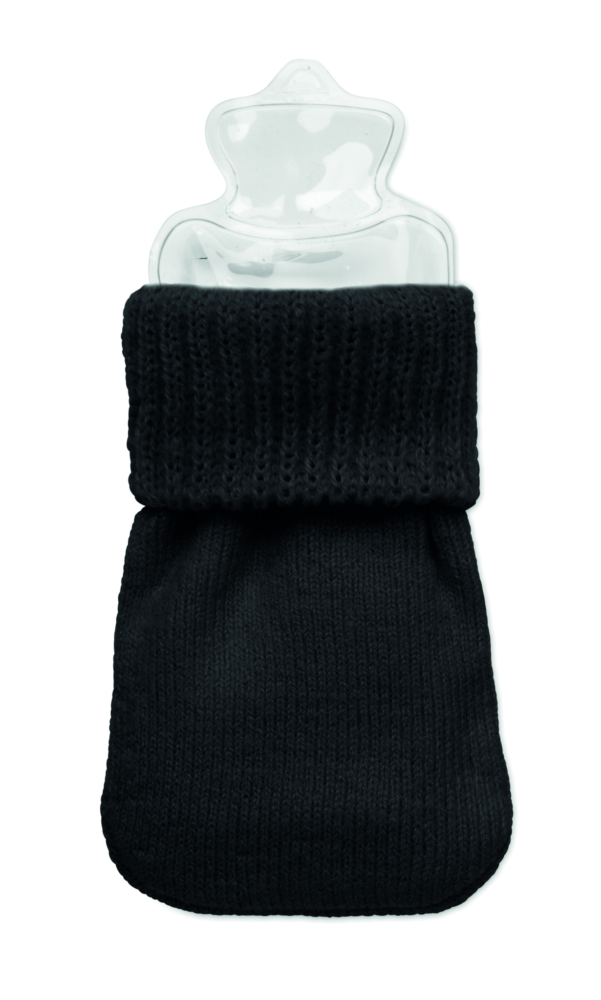 Handvärmare i stickad polyester. Inkl. handvärmare i PVC som aktiveras genom att trycka på metallplattan på insidan. Återanvändbar genom att lägga värmedynan i varmt vatten.