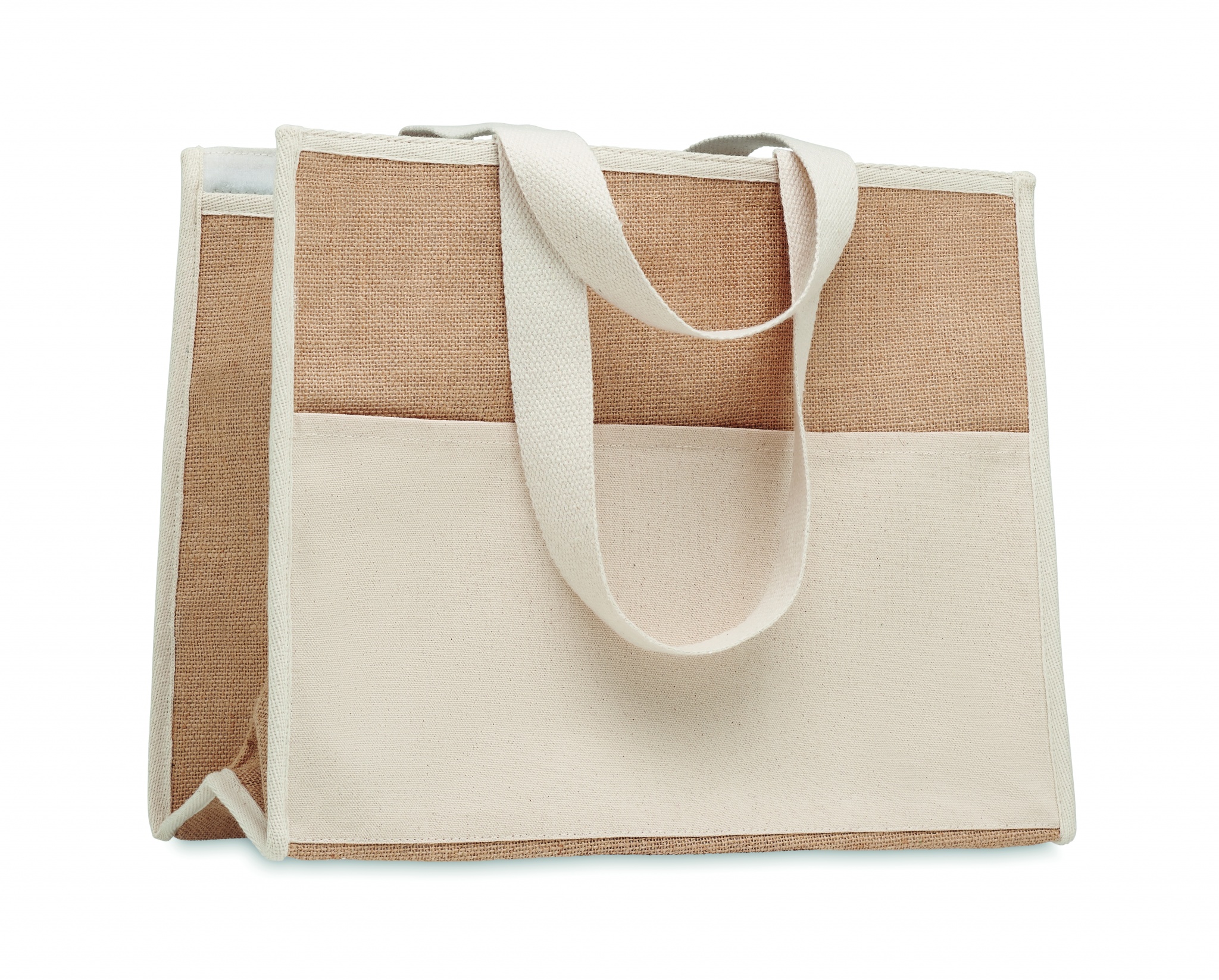 Jutekasse med långa handtag och kardborre stängning. Ficka på framsida i canvas och bomullsband.