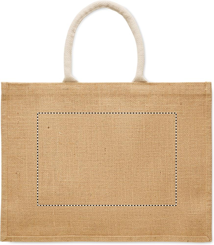 Kasse av laminerad jute och 280 gr/m² bomullscanvas med handtag av rep. Innehåller stor öppen ficka framtill.