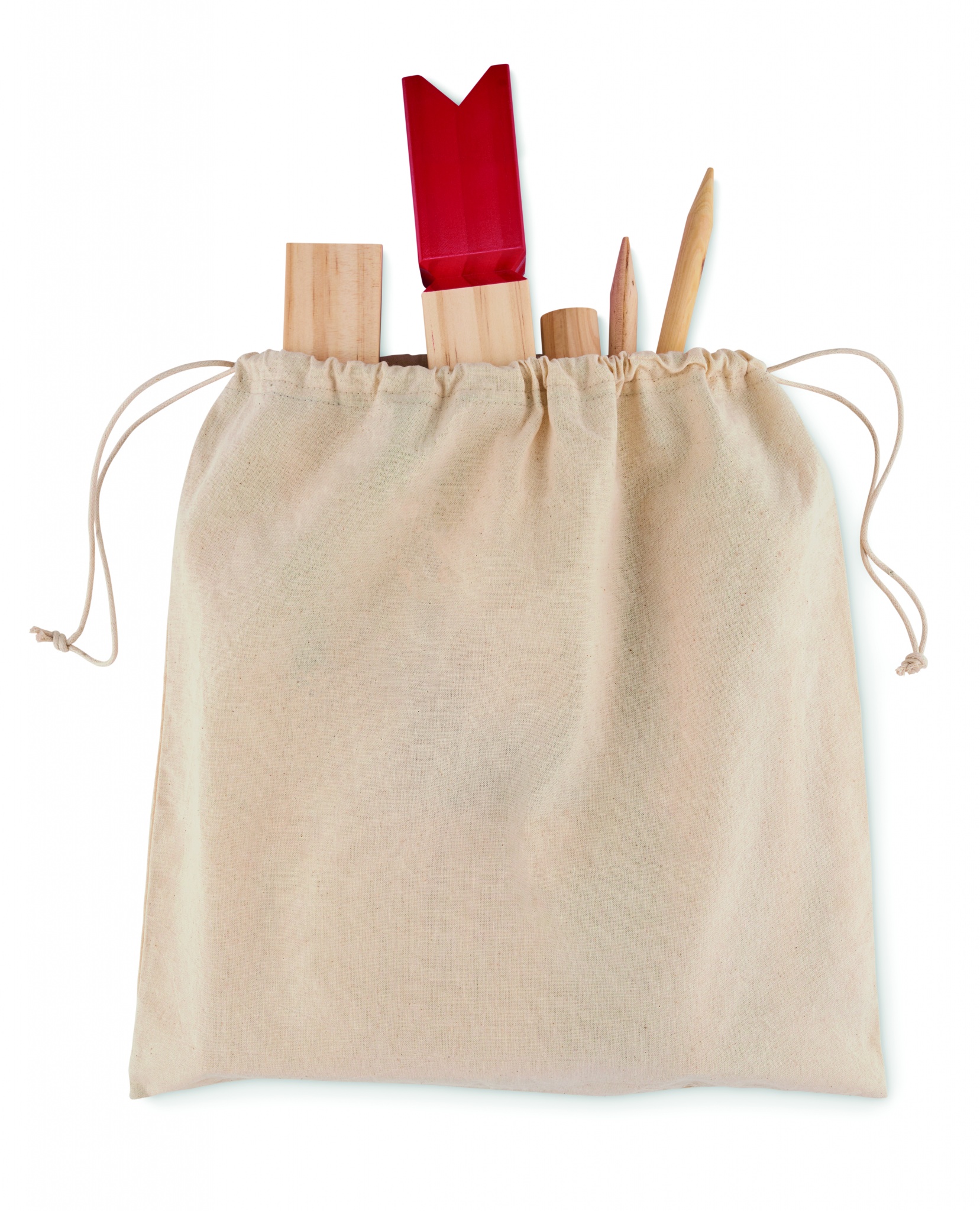Kubbspel i furuträd i bomullsväska med dragsko. Innehåller 10st korta fyrkantiga pinnar, 4st spetsiga pinnar, 6st runda pinnar och 1st kungspinne.